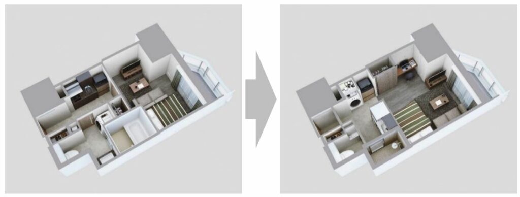 ผู้พัฒนาอสังหาฯรายใหญ่อย่าง Mitsubishi Jisho Residence ได้ทำการออกแบบใหม่ในคอนโดมิเนียม The Parkhabio Kameido ที่สร้างขึ้นใหม่ในเขต Koto กรุงโตเกียว พวกเขารู้สึกว่าแผน Roomot ใหม่นี้ ซึ่งเป็นการผสมผสานระหว่างคำว่า “ห้อง” และคำว่า “มากกว่า” ในภาษาญี่ปุ่น – มีประสิทธิภาพในการเพิ่มพื้นที่ใช้สอยให้สูงสุด และลดการใช้น้ำและก๊าซ