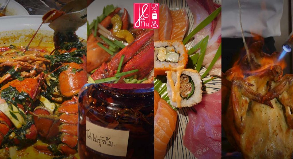 อาหารซีฟู้ดมีทั้งปูม้า ปูทาราบะ ก้าม lobster กุ้งหวาน หอยหวาน กับน้ำจิ้มซีฟู้ดหลากหลายประเภท