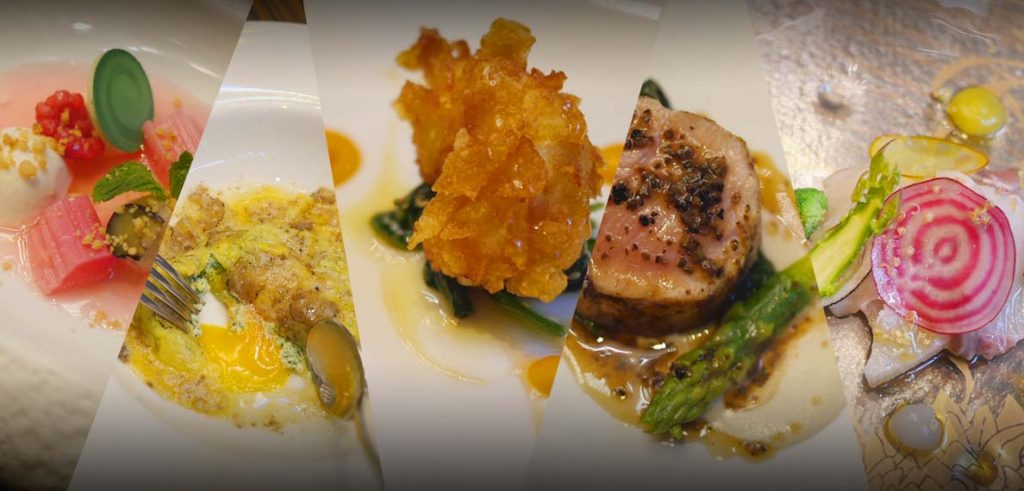 พบกับเมนูไฮไลต์ อาทิ ปลาสำลีน้ำลึกหมักกับส้มยูซุปรุงรสด้วยละอองของจินและโทนิค (Marinated amberjack with yuzu, baby vegetables and a spray of gin and tonic) หอยเชลล์ย่างกับซอสที่เข้มข้นปรุงจากหอยนางรมและมาร์ตินี่ เสิร์ฟพร้อมหอยตลับกับสมุนไพร (Scallops all plancha come with a reduction of oysters and dry martini, as well as clams with herbs) เนื้อลูกวัวสันนอกเสิร์ฟพร้อมเห็ดทรัฟเฟิลดำ