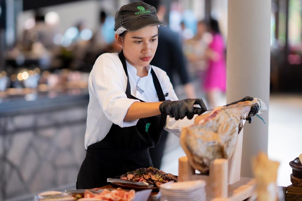 ไลน์อัพบุฟเฟ่ต์เริ่มต้นด้วยสเตชันซีฟู้ดสดที่เสิร์ฟหอยนางรมฝรั่งเศสคู่กับซอสและเครื่องเคียงที่คัดสรรอย่างพิถีพิถัน แถมยังจัดเต็มกับซาชิมิทูน่า แซลมอน และฮามาจิ ที่ปรุงรสอย่างเรียบง่ายเพื่อชูรสชาติความสดของวัตถุดิบ