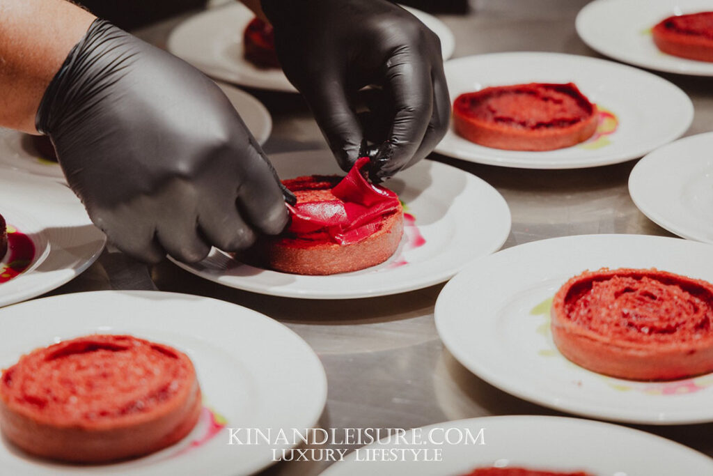ที่ประกอบด้วยทาร์ทาร์หอยเชลล์ฮอกไกโด เสิร์ฟพร้อมครีมรมควันและบีทรูตซิฟฟองนุ่ม ด้านบนแต่งด้วยบีทรูตอบ น้ำมันเฮิร์บทารากอน และผงบีทรูต เพิ่มสีสันและรสสัมผัสในทุกคำ - Egg Benedict on Red Brioche