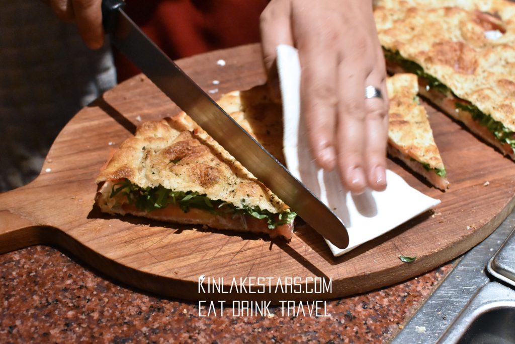 พิซซ่าหน้านี้มีมาตั้งแต่ห้องอาหารเปิดแล้ว กล่าวได้ว่าถ้ามาที่นี่แล้วไม่ได้สั่งพิซซ่าเมนูนี้ เหมือนมาไม่ถึงร้าน La Scala เป็นพิซซ่าที่หน้าตาคล้ายกับแซนด์วิช แป้งบางกรอบสองแผ่นประกบกัน ด้านในเป็นพาร์มาแฮมสไลด์บางๆ รสชาติเค็มกำลังดี ตรงกลางเป็นผักร็อกเก็ตนำเข้าเกรดพรีเมียม กลิ่นหอม ทานง่าย สอดไส้ด้วยมาสคาโปนชีส เป็นชีสสดรสชาติเบานุ่ม ละมุนลิ้น และด้านล่างเป็นมะเขือเทศฝานสด หวาน แป้งด้านนอกจะโรยด้วยโรสแมรี่เพิ่มความหอม ทานพร้อมกันแล้วรสชาติกลมกล่อม เป็นการผสมผสานวัตถุดิบได้ลงตัวมาก พิซซ่านี้จะเสิร์ฟมาคู่กับมะกอก รสชาติเค็มนิดๆ ทำให้เพิ่มรสชาติให้กับพิซซ่ายิ่งขึ้น ตัดเลี่ยนได้ดี