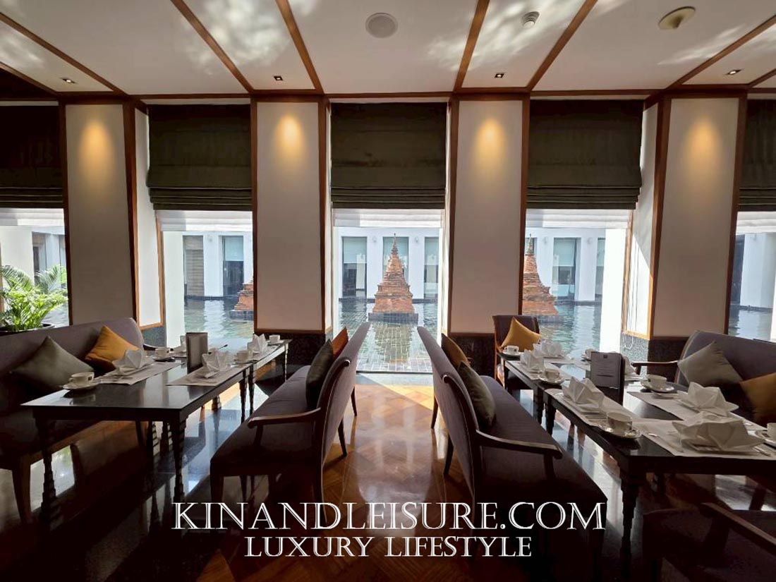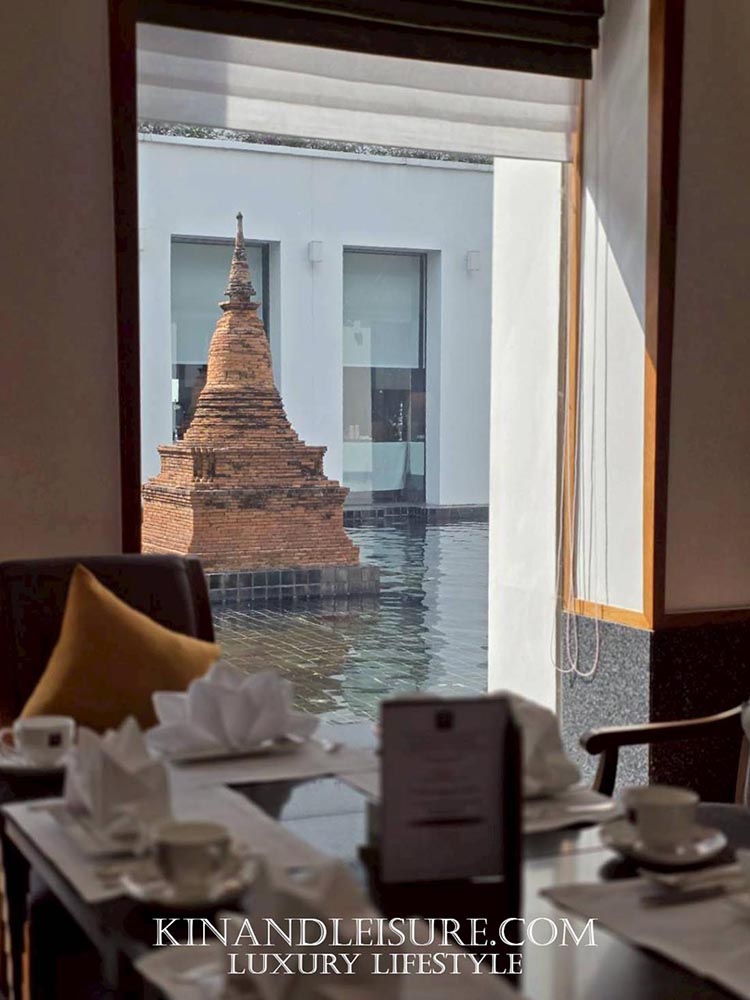 - เจดีย์และน้ำ: การมีเจดีย์จำลองที่ตั้งตระหง่านอยู่บนผืนน้ำนิ่งสงบ (Water Feature) นอกหน้าต่างห้องอาหาร ช่วยสร้างมิติของความลึกและความศักดิ์สิทธิ์ สะท้อนถึง “ความสุขทางใจ” ในดินแดนสุโขทัย