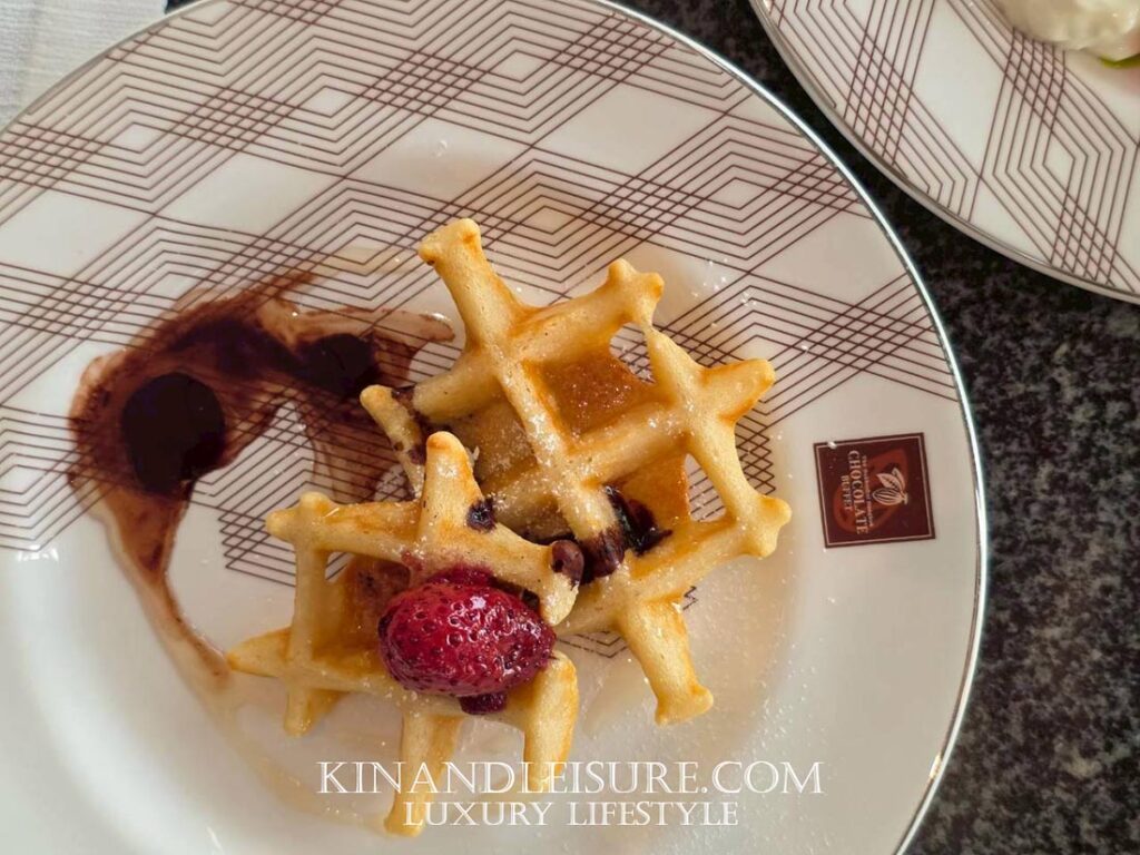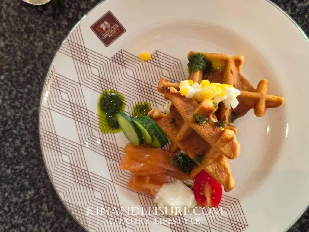 ปิดท้ายพาร์ทของคาวด้วยสถานีวาฟเฟิลที่ทำสดใหม่จานต่อจาน กลิ่นเนยแท้ฟุ้งกระจายไปทั่วบริเวณ พีทเลือกสั่งแบบ Savory ที่เสิร์ฟคู่กับ Salmon รมควันและซอสครีมขาว ตัววาฟเฟิลมีความพิเศษที่ผิวภายนอกจะกรอบเบาๆ แต่เนื้อสัมผัสภายในนุ่มฟูราวกับก้อนเมฆ (Airy & Fluffy) ความหวานจางๆ ของแป้งวาฟเฟิลเมื่อเจอกับความเค็มหอมของแซลมอนรมควันและซอสรสเปรี้ยวนิดๆ คือความกลมกล่อมที่ลงตัวสุดๆ ครับ เป็นเมนูที่สะท้อนถึงแนวคิด “create your perfect beverage and meal” ได้เป็นอย่างดี และอีกจานแบบหวานคุณซันสั่งมาลองทางก็อร่อยเลิศไปเลย