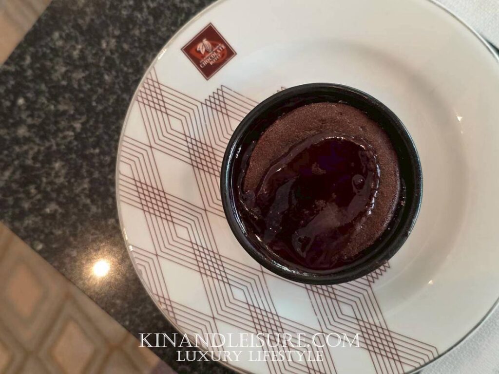ระหว่างที่พีทกำลังเพลิดเพลินกับบรรยากาศอยู่นั้น ไฮไลท์สำคัญก็ปรากฏตัวขึ้นครับ เมื่อเชฟเข็นรถทอเร่ (Gueridon) ตรงมาที่โต๊ะเพื่อเสิร์ฟ “Chocolate Soufflé” แบบร้อนๆ ที่เพิ่งออกจากเตา