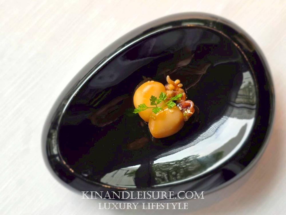 ท่านจะพบกับไข่นกกระทาที่ผ่านการแช่ในน้ำชาดำจนผิวมีสีน้ำตาลสวยงามและมีกลิ่นหอมสมุนไพรจางๆ ความมันของไข่แดงสอดรับกับความเด้งของกุ้งอย่างไม่น่าเชื่อ ท็อปด้วยคาเวียร์ที่เพิ่มมิติความเค็มเล็กน้อย เป็นคำที่ให้รสกลมกล่อมและซับซ้อนอย่างยิ่ง