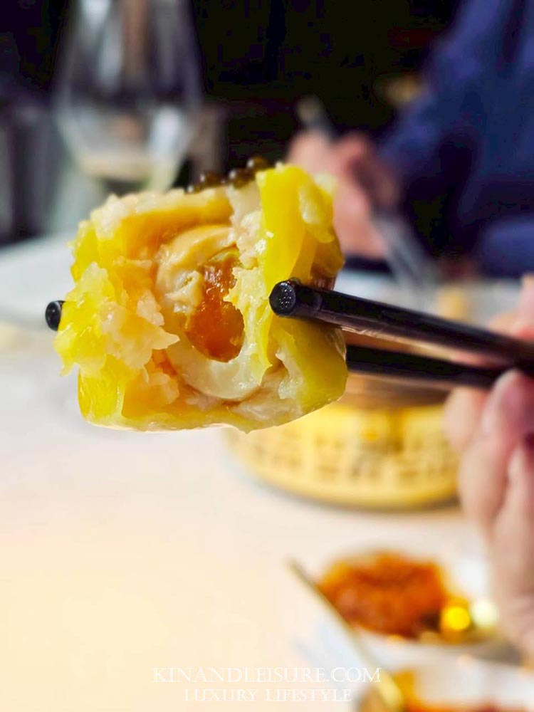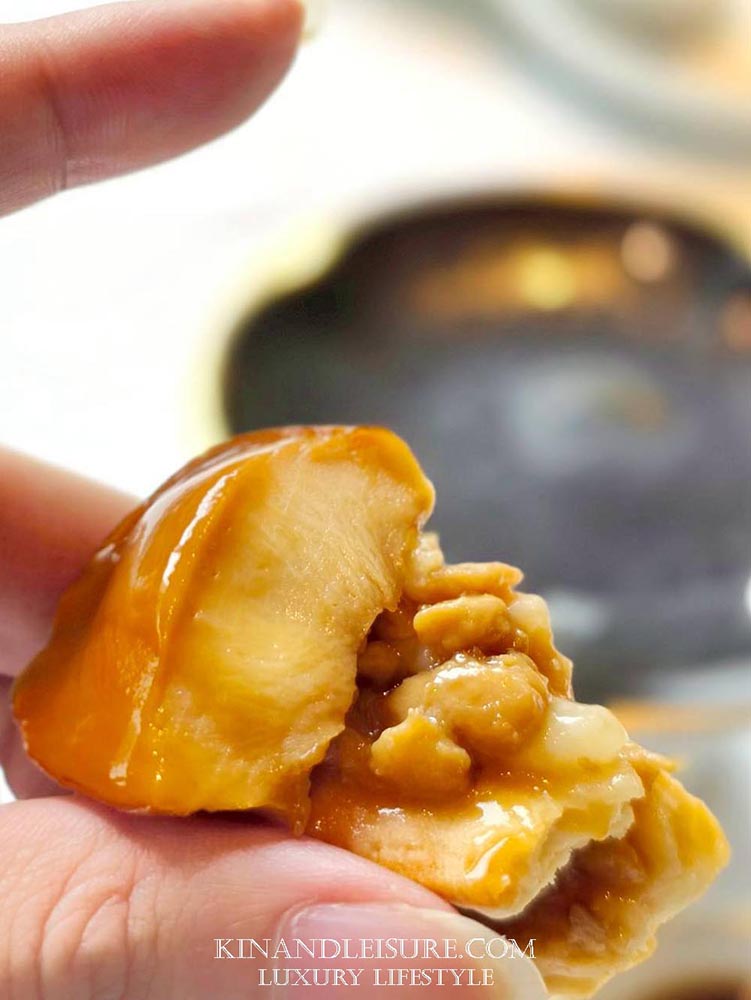 เมื่อคุณกัดลงไป ความประหลาดใจรออยู่ในไส้ครับ! มันไม่ใช่แค่เนื้อไก่ แต่มี กระเพาะปลาสด (Fresh Fish Maw) ชิ้นเขื่องซ่อนอยู่ กระเพาะปลาสดจะมีความนุ่มหนึบคล้ายเยลลี่ชั้นดี ซึ่งช่วยเสริมรสสัมผัสกับเป๋าฮื้อได้อย่างมหัศจรรย์ เป็นคำที่รวบรวมเอา “ทองคำแห่งท้องทะเล” มาไว้ในคำเดียว รสชาติมันช่างล้ำลึก หวาน หอม มัน และทิ้ง Aftertaste ของซอสเป๋าฮื้อเข้มข้นไว้ที่โคนลิ้นอย่างยาวนาน