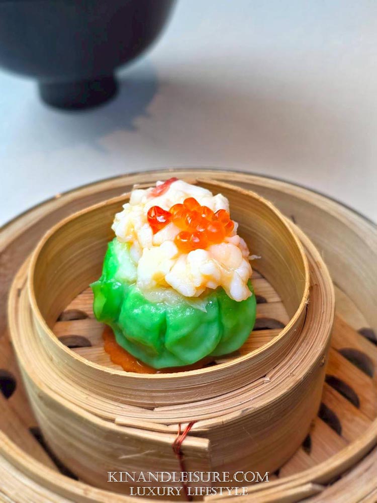 ลืมขนมจีบหมูแบบเดิมๆ ไปได้เลยครับ จานนี้คือการนำ “ราชาแห่งท้องทะเล” มาสวมชุดราตรีสีเขียวมรกต แป้งที่ผสมน้ำสกัดจากผักใบเขียวถูกนวดจนเนียนกริบ ห่อหุ้มเนื้อล็อบสเตอร์ที่เชฟ “ลวกพอสะดุ้ง” เพื่อรักษาความเด้งสู้ฟัน (Al Dente) เอาไว้