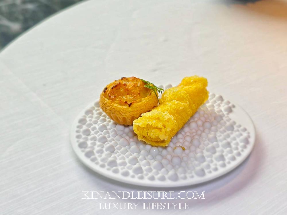 เชฟแนะนำให้เริ่มจากชิ้นนี้ก่อนครับ ผิวสัมผัสด้านนอกถูกทอดจนเป็นสีเหลืองนวลสวยงามและมีความกรอบที่เบาสบาย (Airy Crispness) ภายในอัดแน่นด้วยเนื้อกุ้งมังกรที่ยังคงความฉ่ำวาวและหวานเด้ง ราวกับเพิ่งขึ้นจากท้องทะเล