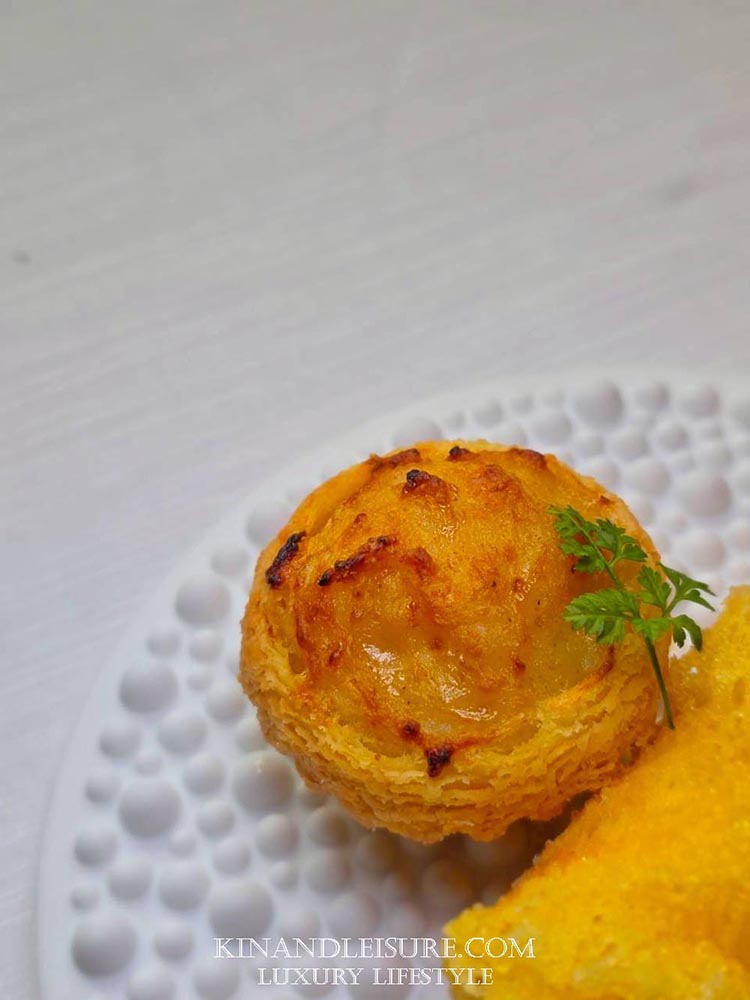 มาถึงตัว “พระเอก” ที่ผมขอยกให้เป็น Masterpiece ของปี 2025 พัฟชิ้นนี้คือความบ้าคลั่งในรายละเอียด แป้งพัฟถูกรีดทับสลับชั้นจนนับร้อยชั้นเพื่อให้ได้ความกรอบที่ร่วนและเบาสบาย ท็อปด้วย เป๋าฮื้อโฮลพอร์ต (Whole Abalone) ตัวหนาที่ผ่านการเคี่ยวกับซอสพรีเมียมจนผิวเป็นสีน้ำตาลทองเงางามราวกับอัญมณีเคลือบน้ำตาล