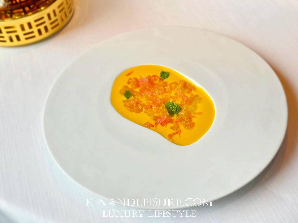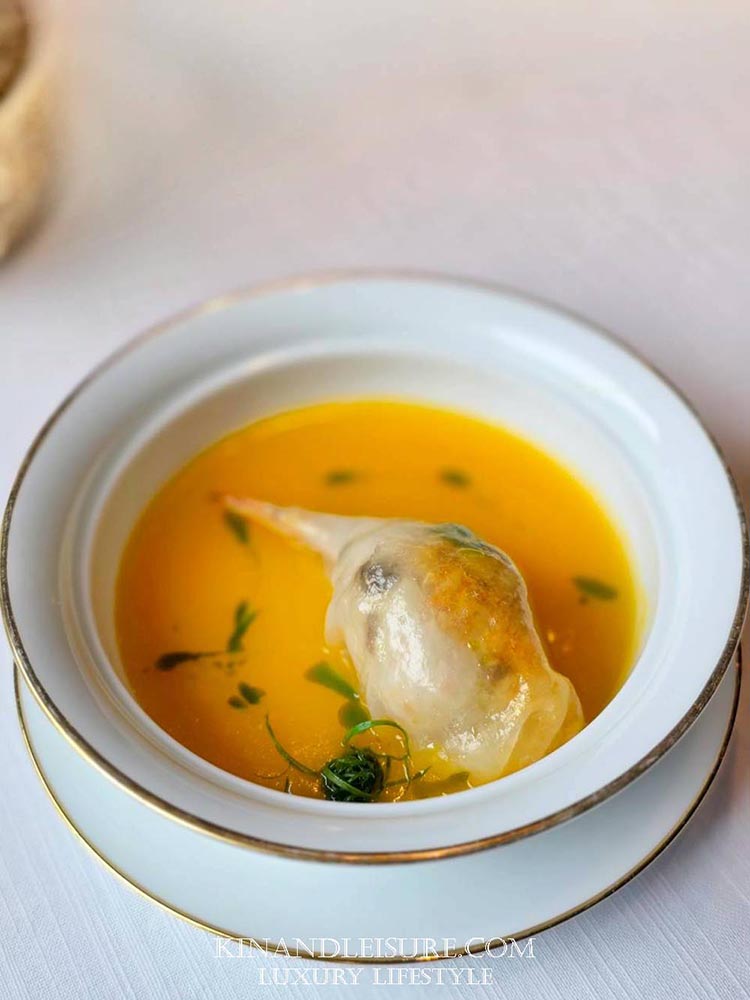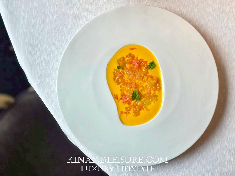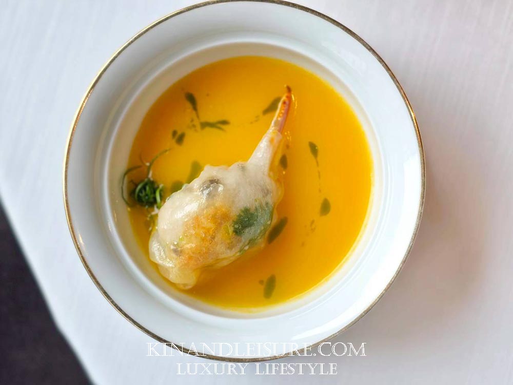 หนึ่งในเมนูซิกเนเจอร์ของเชฟ ที่ฟังดูตอนแรกอาจจะไม่เข้ากัน เสิร์ฟมาเป็นก้ามปูชิ้นโตนึ่งพร้อมไส้ซีฟู้ดรสละมุน วางสง่าบนซุปฟักทองสีเหลืองทองที่ผสมกับ เห็ดมอเรล เห็ดป่าที่มีราคาสูงและกลิ่นหอมเฉพาะตัว ปรุงรสด้วยน้ำมันต้นหอม แต่พอได้ลองชิมแล้วเป็นจานที่อร่อยมาก ๆ ซุปฟักทองมีความอูมามิอุ่นท้อง และความหอมอ่อน ๆ ของฟักทอง เมื่อรวมกับรสชาติของก้ามปูเข้ากันได้ดีมาก เป็นจานที่รวมความหวานจากทะเลและความหอมจากพงไพรได้อย่างอัศจรรย์