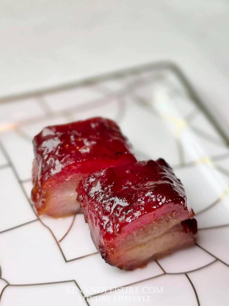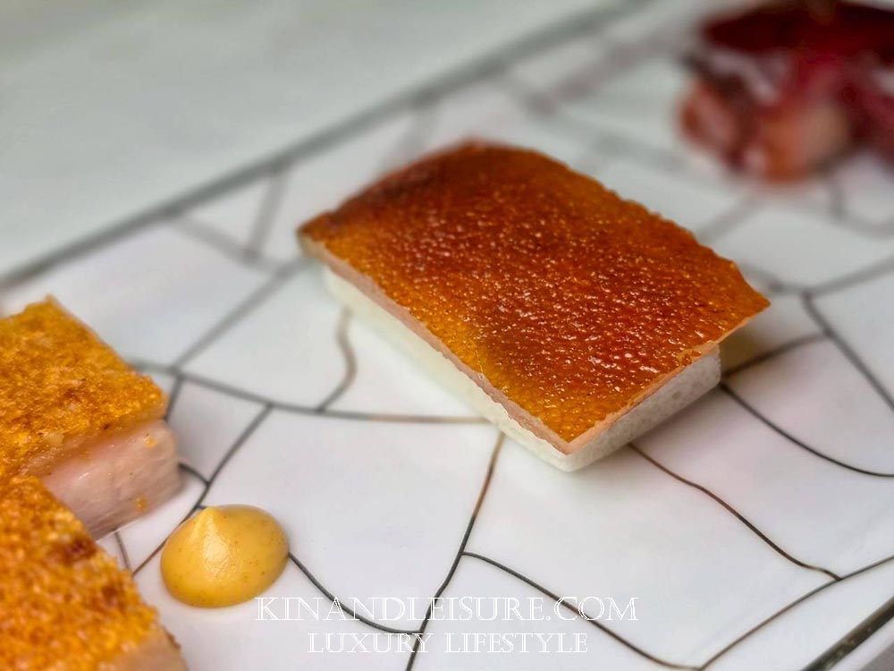 พระเอกของจานนี้คือหมูกรอบที่เชฟคัดส่วนท้องที่มีสัดส่วนเนื้อและไขมันสลับกันอย่างลงตัว ท่านจะเห็นว่าชิ้นหมูกรอบที่นี่จะไม่หนาจนเลี่ยน แต่มีความประณีตในการเรียงเลเยอร์ความอร่อยถึง 5 ชั้น