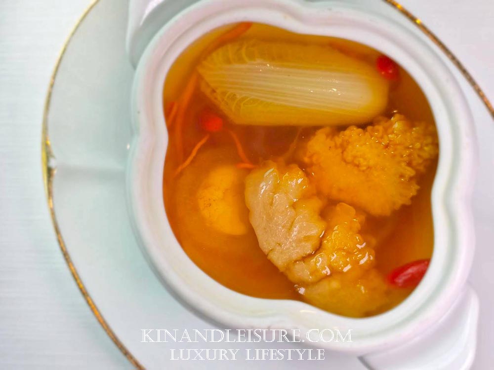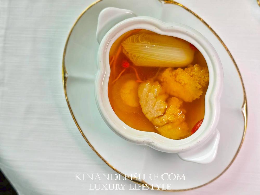 ทันทีที่ซุปช้อนแรกแตะที่ปลายลิ้น ท่านจะรู้สึกถึงความหวานลึก (Deep Sweetness) ที่ค่อยๆ แผ่ซ่านไปทั่วช่องปาก มันไม่ใช่ความหวานจากน้ำตาล แต่เป็นความหวาน “เช็ง” แบบดั้งเดิมที่เกิดจากการสกัดโปรตีนและแร่ธาตุออกมา เป็นซุปที่ทานแล้วรู้สึกได้ถึงความกระปรี้กระเปร่า สมกับที่เป็นซุปในระดับตำนานที่เสิร์ฟในวังหลวง