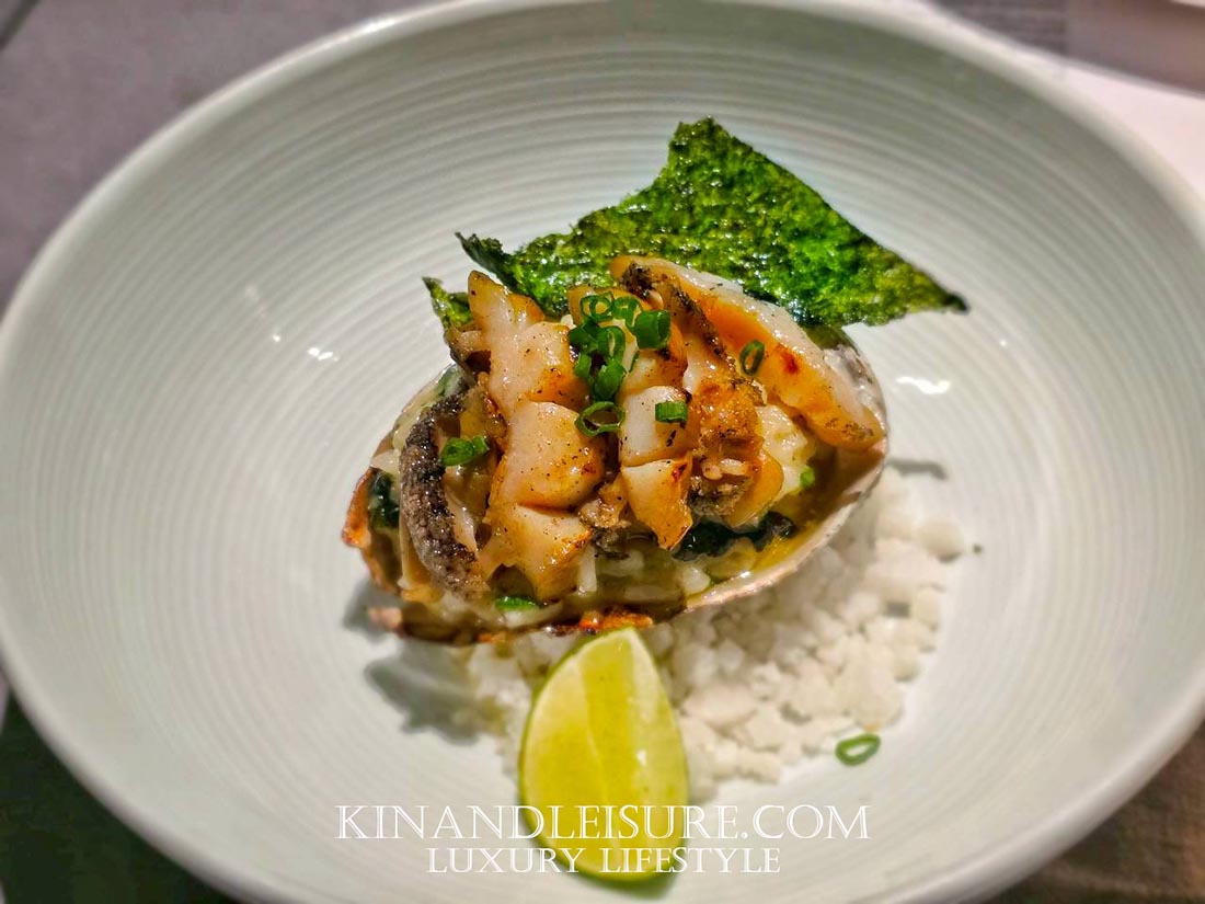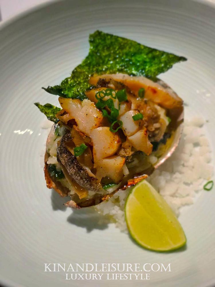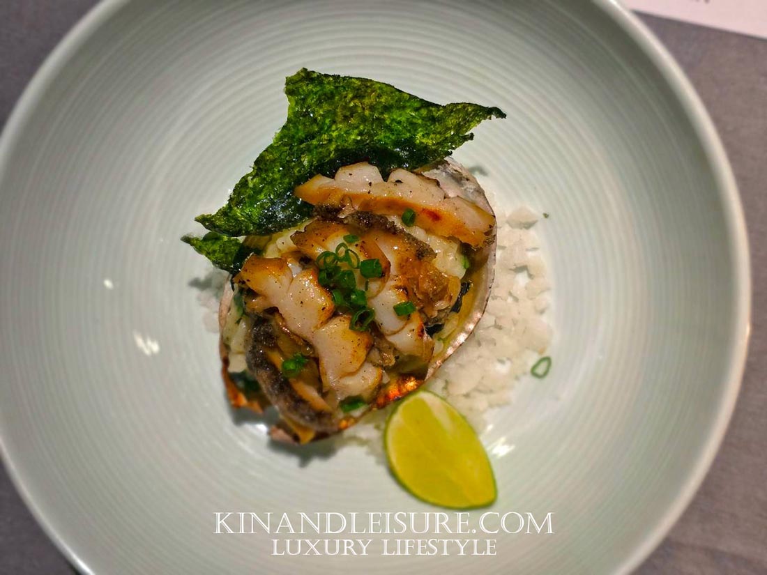 เสริมรสด้วย Scallion และการใช้ Lime สดบีบลงไปเพื่อสร้างความสว่างจากรสเปรี้ยวสดชื่นและกลิ่นซีตรัส ให้กับจานอาหาร จากรูปจะเห็นการจัดจานที่ดูเป็นธรรมชาติ (Organic Shape) วางอยู่บนเตียงของเกลือหรือวัสดุสีขาวที่ช่วยขับให้ตัวเปลือกเป๋าฮื้อและเนื้อด้านในดูมีคุณค่าราวกับอัญมณีจากท้องทะเลลึก เป็นจานที่พิสูจน์ว่าวัตถุดิบชั้นเลิศเมื่อผ่านมือที่เข้าใจรสชาติ ไม่จำเป็นต้องปรุงแต่งจนเกินงาม