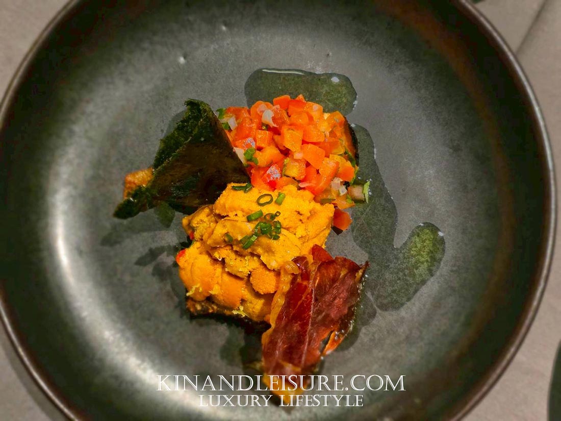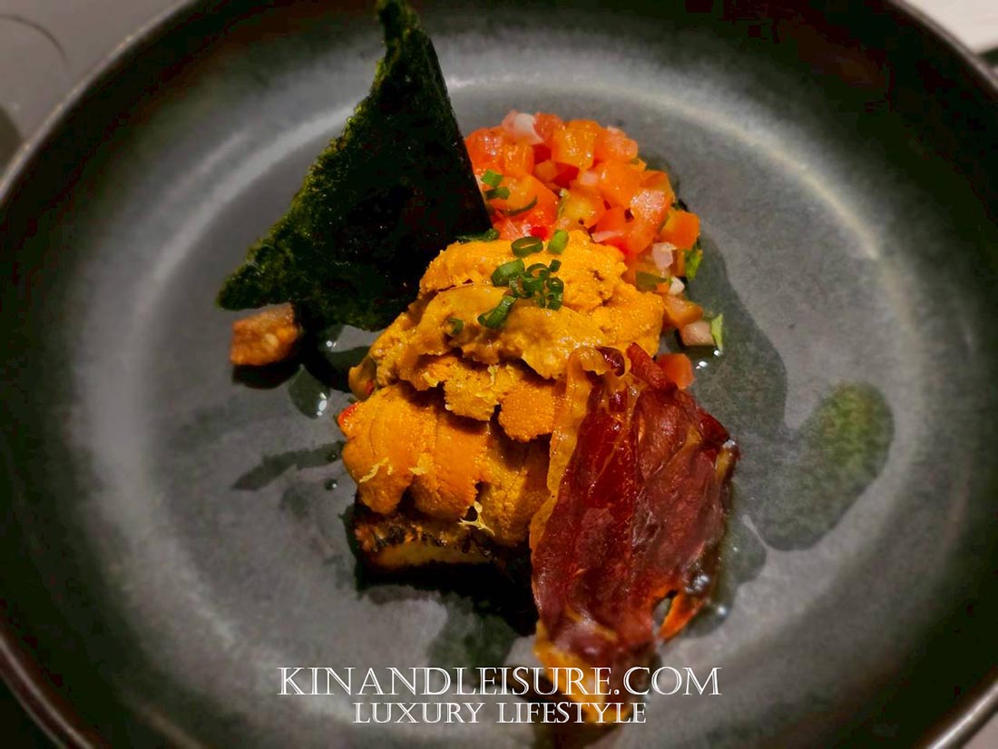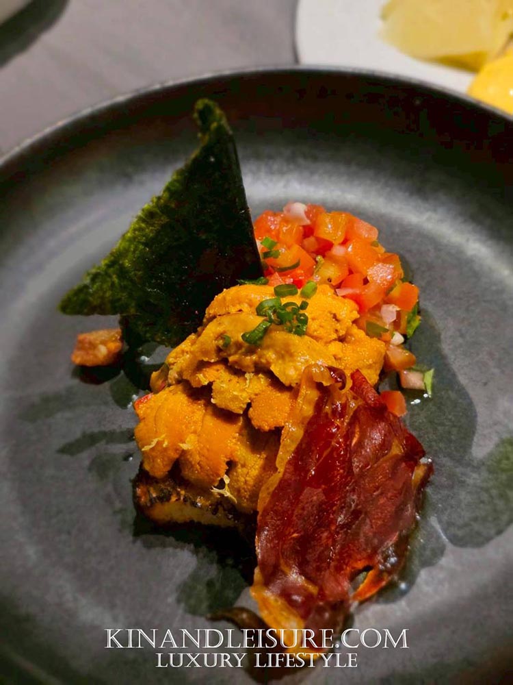หัวใจของมหาสมุทรที่วางตัวบนความกรอบแห่งดินแดนเมดิเตอร์เรเนียน นี่คือการนำเสนอ Umami ในรูปแบบที่เข้มข้นที่สุด จานนี้โดดเด่นด้วยการใช้ Sea Urchin (Uni) เกรดพรีเมียมที่ส่งกลิ่นหอมไอทะเลจางๆ วางเรียงตัวอย่างประณีตบนขนมปังบรูสเก็ตต้าที่ย่างจนมีสีน้ำตาลทอง (Sourdough Base) เสริมความซับซ้อนด้วย Serrano Ham แผ่นบางเฉียบที่ผ่านการบ่มจนได้รสเค็มลุ่มลึก