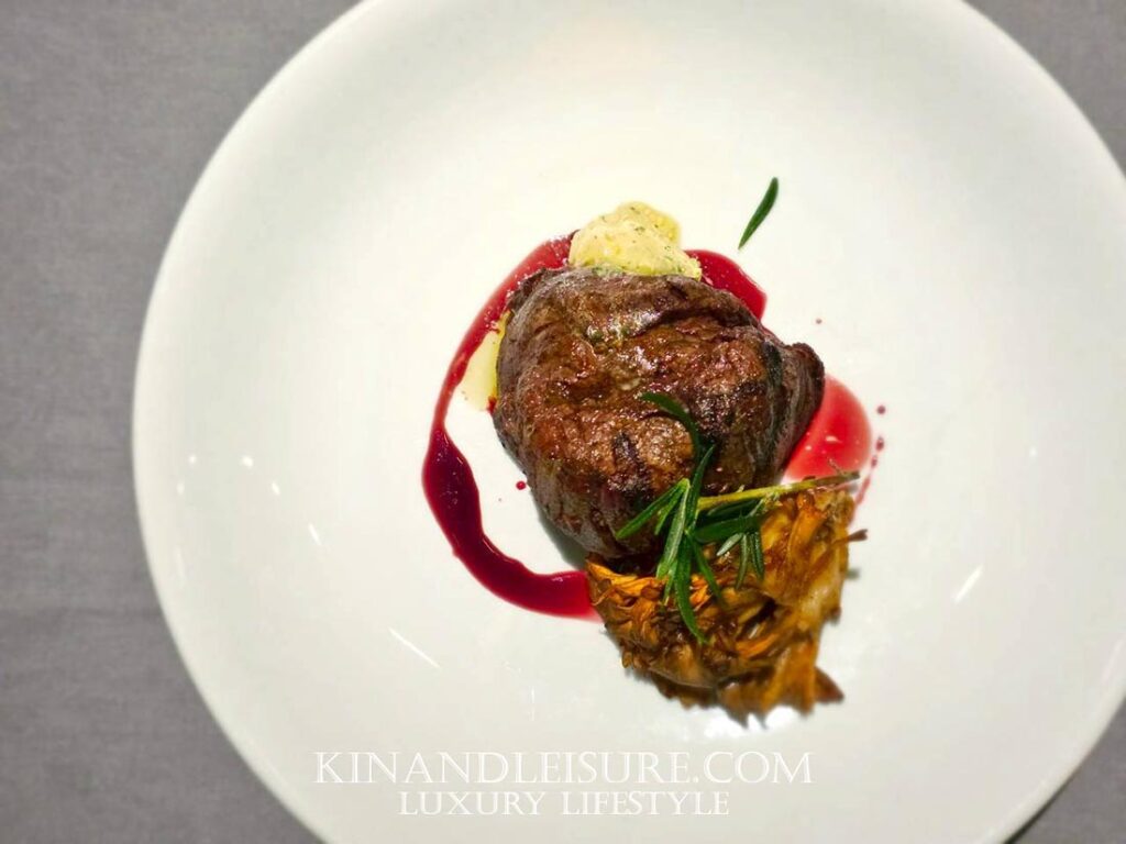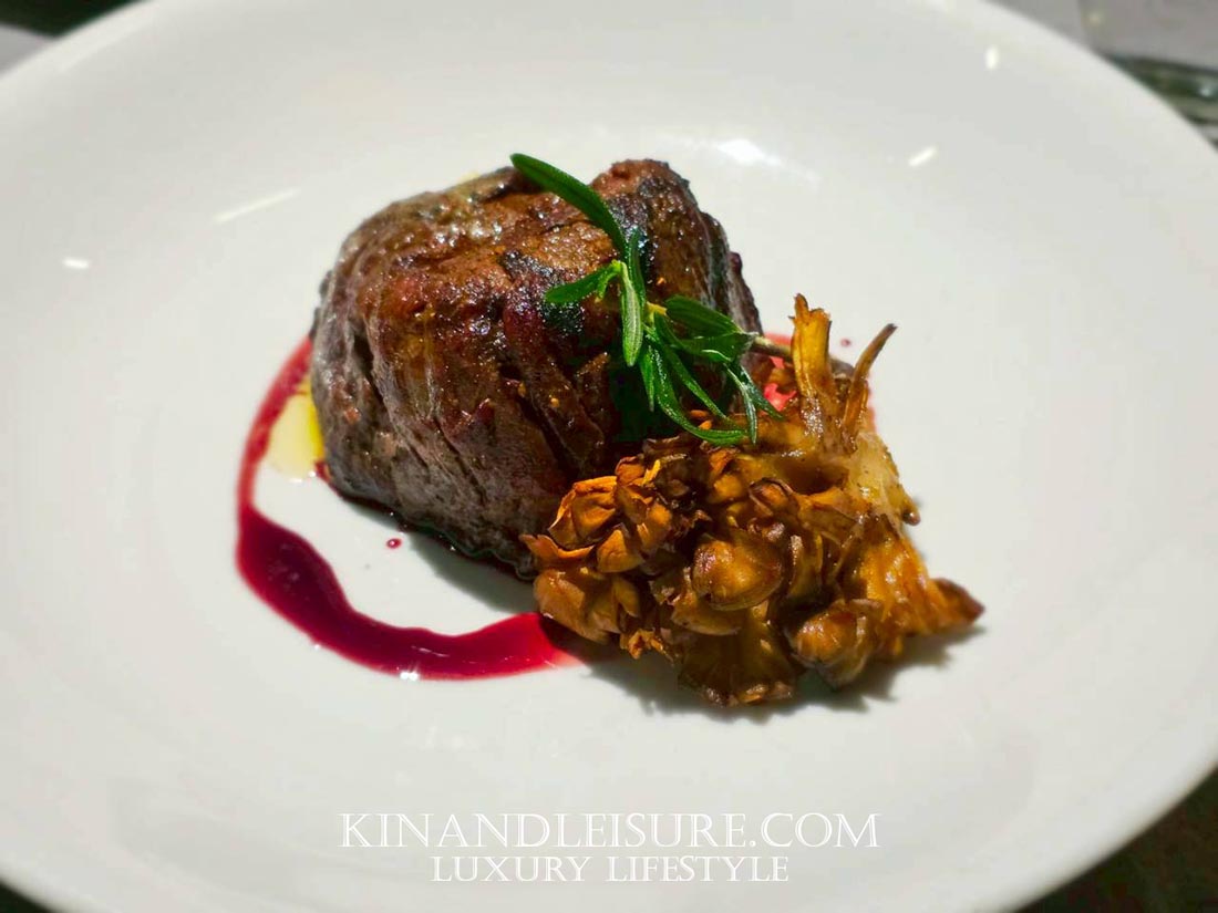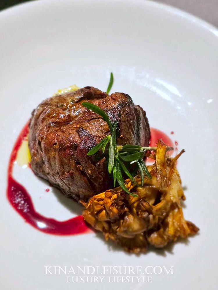 เคียงมากับ Maitake Mushroom ที่มีเนื้อสัมผัสเฉพาะตัวและกลิ่นหอมไม้ป่า เสริมด้วย Rosemary ที่ส่งกลิ่นหอมอโรม่าสร้างความรื่นรมย์ในระหว่างทาน จากรูปการณ์พรีเซนต์เน้นความสุขุมดุ่มลึก ใช้การปาดซอสไวน์แดงเป็นวงโค้งที่ขอบจาน (Sauce Smear) ช่วยสร้างทิศทางสายตาไปสู่ชิ้นเนื้อที่เป็นหัวใจสำคัญของจาน เป็นเมนูที่สะท้อนความถนัดของเชฟในการจัดการกับเนื้อแดงได้อย่างไร้ที่ติ