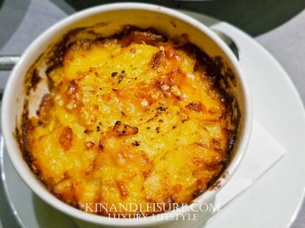 เครื่องเคียงที่อบอวลด้วยความอบอุ่นและนุ่มนวล เมนูเครื่องเคียงที่เรียบง่ายแต่ทรงพลัง ด้วยการสไลด์มันฝรั่งบางๆ เรียงชั้นกับต้นหอมญี่ปุ่น (Leek) และครีมชีสที่เข้มข้น อบจนผิวหน้าเป็นสีน้ำตาลไหม้สวยงาม (Golden Crust) มอบกลิ่นหอมมันของนมและเนยที่เย้ายวนใจ เสิร์ฟมาในถ้วยเซรามิกขนาดพอเหมาะที่เก็บความร้อนได้ดีเยี่ยม เป็นคู่แท้ที่ช่วยส่งเสริมรสชาติของเมนูเนื้อได้อย่างไร้ที่ติ