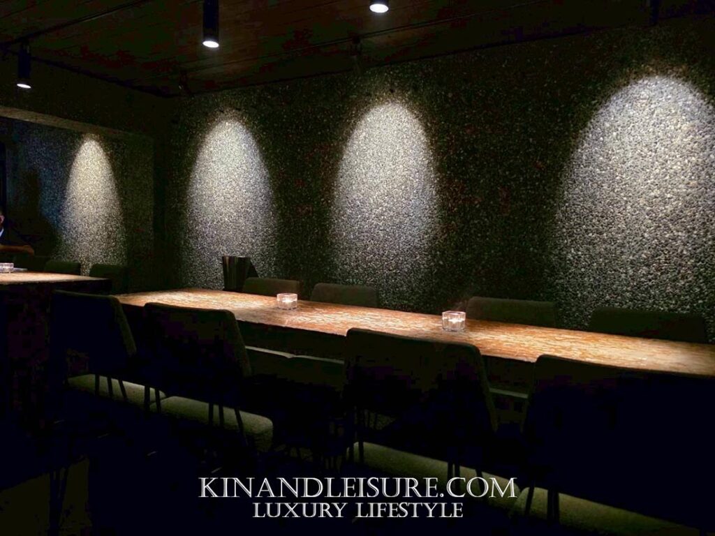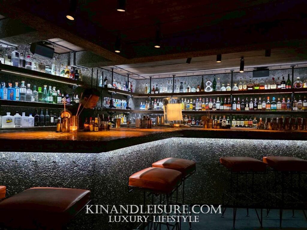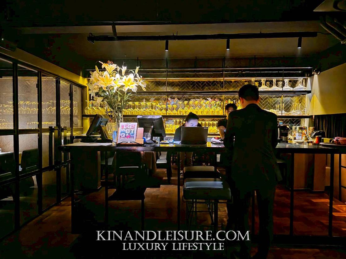 - The Bar: ความลึกลับที่น่าหลงใหล โซนบาร์ถูกออกแบบให้มีความเข้มขรึมและเป็นส่วนตัว ผนังหินขัด (Terrazzo) สีเข้มตัดกับแสงไฟวอร์มไวท์ที่ส่องสว่างบนชั้นวางเครื่องดื่มหลากหลายชนิด สร้างบรรยากาศแบบกึ่งเลานจ์ที่เหมาะสำหรับการจิบเครื่องดื่มก่อนหรือหลังมื้ออาหาร