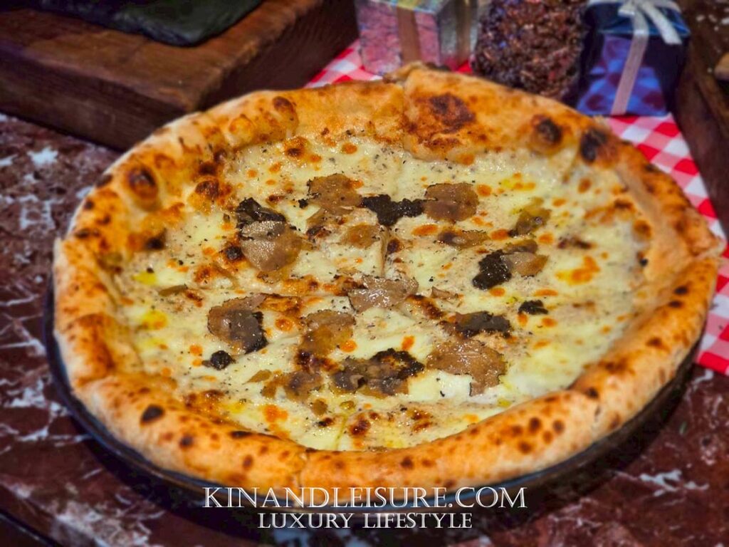 แป้งบางกรอบหอมกรุ่นจากเตาร้อน ชีสยืดหย่อนไหลเยิ้มดูเพิ่มรส กลิ่นเครื่องเทศหอมจัดชัดเจนยศ รสสัมผัสกรุบกรอบหมดจดใจ เครื่องเคราแน่นเต็มคำไม่ขาดสาย กลิ่นไหม้จางๆชวนไหลหลง รสสัมผัสแป้งนุ่มที่มุ่งตรง เป็นความลงตัวแท้ของอิตาลี