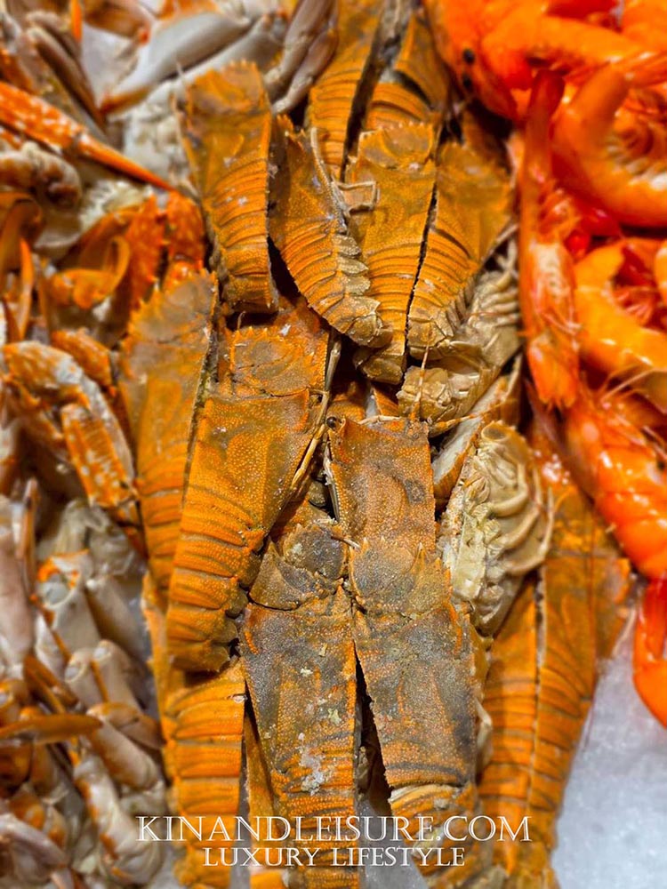 กั้งกระดานตัวโตสีส้มระเรื่อเรียงเป็นตับ เนื้อแน่นเด้งดูดซับความหวานจากท้องทะเลไว้เต็มเปี่ยม เคียงข้างด้วยกุ้งแม่น้ำสีส้มสดใสผิวมันวาวชวนมอง กลิ่นหอมของเปลือกกุ้งที่สุกกำลังดีนั้นเย้ายวนชวนน้ำลายสอ เมื่อแกะเนื้อออกจะพบความยืดหยุ่นสู้ฟันอันเป็นเอกลักษณ์ ปรุงรสด้วยความสดเพียงอย่างเดียวก็เกินพอ รสหวานตามธรรมชาติ