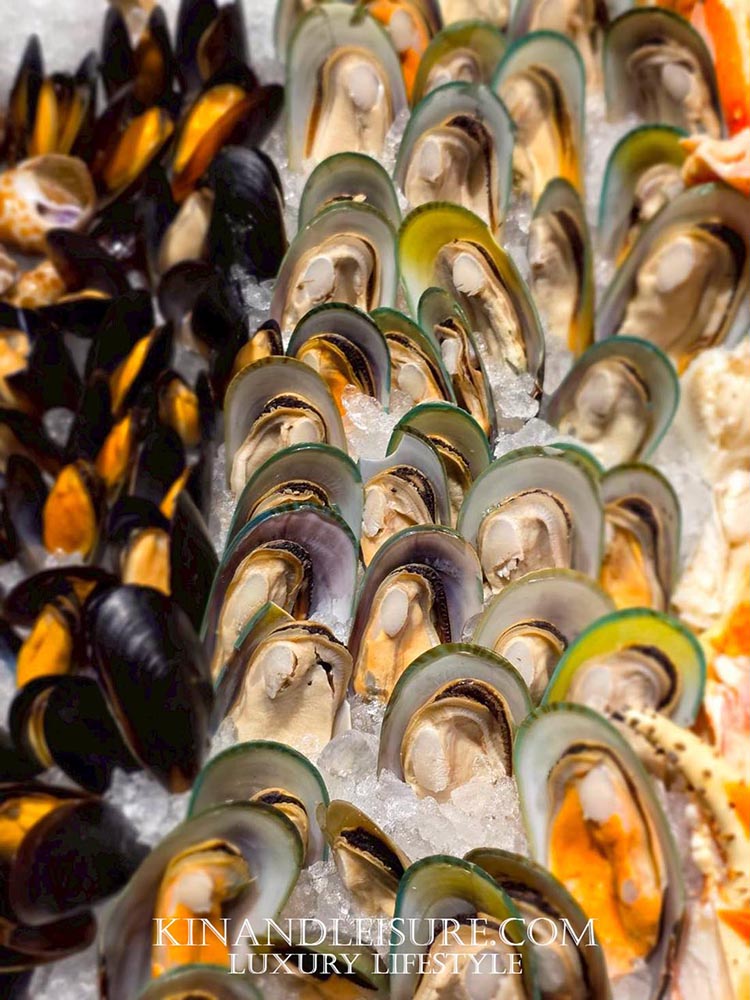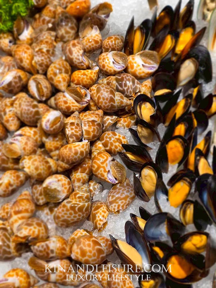 หอยหวานลายสวยสีน้ำตาลนวลเนื้อหนึบแน่น วางคู่หอยแมลงภู่ตัวโตเปลือกเขียวมรกตที่เปิดโชว์เนื้อขาวอวบอัด สัมผัสของหอยหวานนั้นหนึบสู้ฟันให้รสสัมผัสที่น่าจดจำ ส่วนหอยแมลงภู่นั้นนุ่มนวลและหวานฉ่ำน้ำทะเล กลิ่นคาวไม่มีมากล้ำกรายมีเพียงกลิ่นสะอาดของน้ำแข็งที่ช่วยชูความสดให้เด่นชัด เป็นสำรับเครื่องเคียงทะเลที่ทรงพลังยิ่งนัก