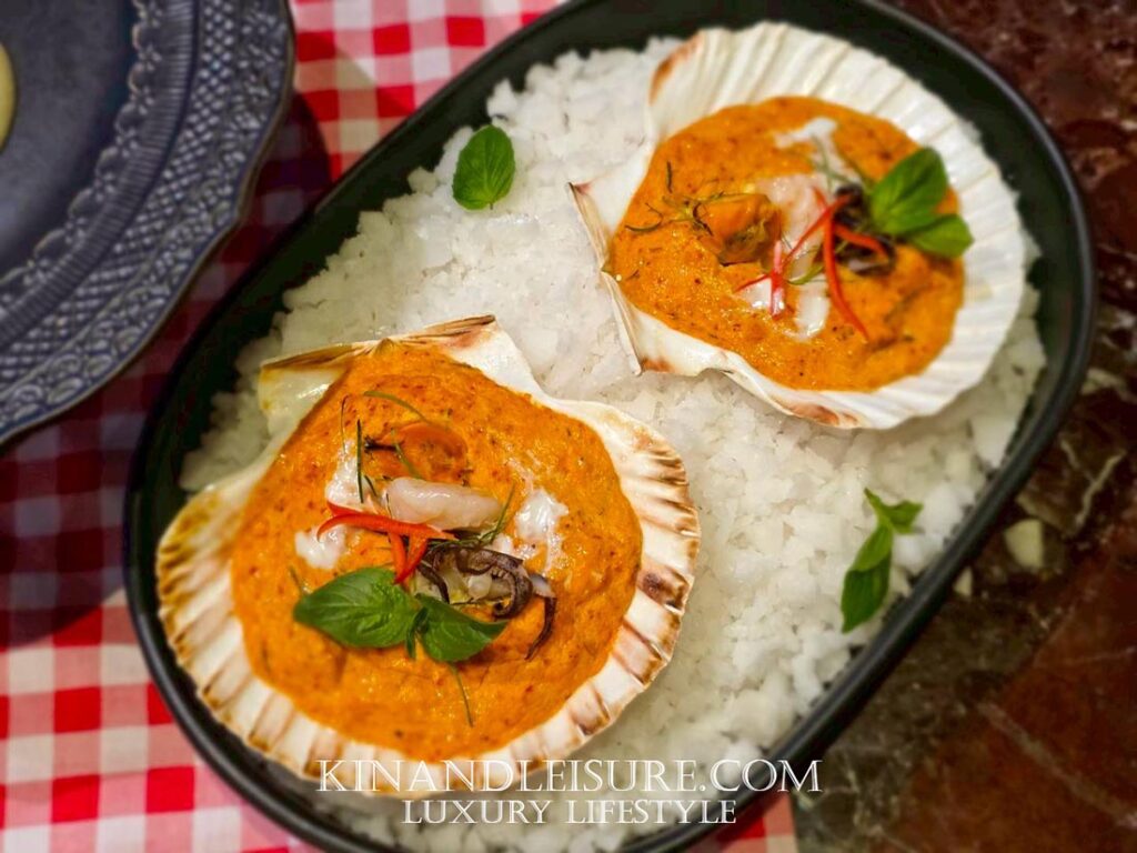 หอยเชลล์ชิ้นโตที่ผ่านการทำความร้อนจนเนื้อหอยเชลล์สีขาวกลมสุกได้ที่ เสิร์ฟมาบนซอสพิวเรพริกหวานสีเหลือง ช่วยเพิ่มรสหวานและเผ็ดฉุนขึ้นเล็กน้อยให้กับเนื้อหอยเชลล์ได้ด้วย