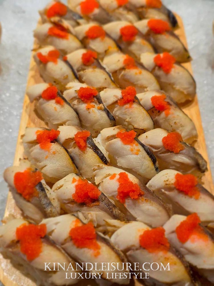 ปลาเนื้อขาวเผาผิวพอขึ้นเงา วางบนข้าวคำน้อยแต่พอดี ไข่กุ้งส้มสดใสประดับไว้เหนือชิ้นปลา สัมผัสมีความหนึบแน่นของเนื้อที่ผ่านความร้อน กลิ่นหอมจากการเผาผิวเรียกน้ำย่อยได้ชะงัดนัก เมื่อขบเคี้ยวความหวานจากเนื้อปลาจะซึมซาบ ผสานความกรุบกรับของไข่ปลา ที่ระเบิดรสชาติในปาก เป็นความเรียบง่ายที่แฝงไปด้วยความพิถีพิถันแห่งการปรุง