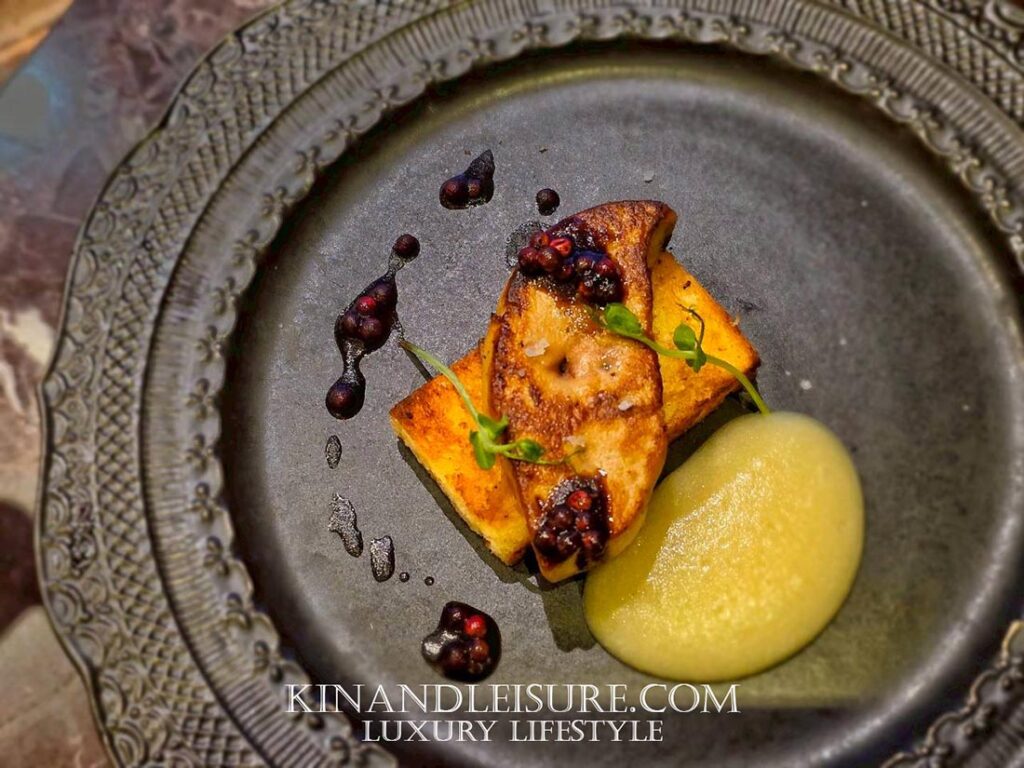 ตับห่านทองคำชิ้นโตโอ่อ่าระยับ วางสลับบนขนมปังปิ้งสีเหลืองนวลหอมกรุ่น ผิวหน้าฟัวกราส์ย่างจนเกรียมสวยแต่เนื้อในละลายระรวยดั่งวิมาน กลิ่นไขมันหอมฟุ้งจรุงใจประสานซอสเปรี้ยวหวานสีเข้มที่หยดประดับดั่งอัญมณี ตัดเลี่ยนด้วยมูสผลไม้เนื้อเนียนละเอียดที่เคียงข้าง สัมผัสแรกคือความกรอบบางของผิวที่ถูกไฟเผา ก่อนจะพบความนุ่มนวลฉ่ำวาวซึมลึกถึงโคนลิ้น รสสัมผัสหรูหราเกินบรรยายประหนึ่งรสแห่งสวรรค์