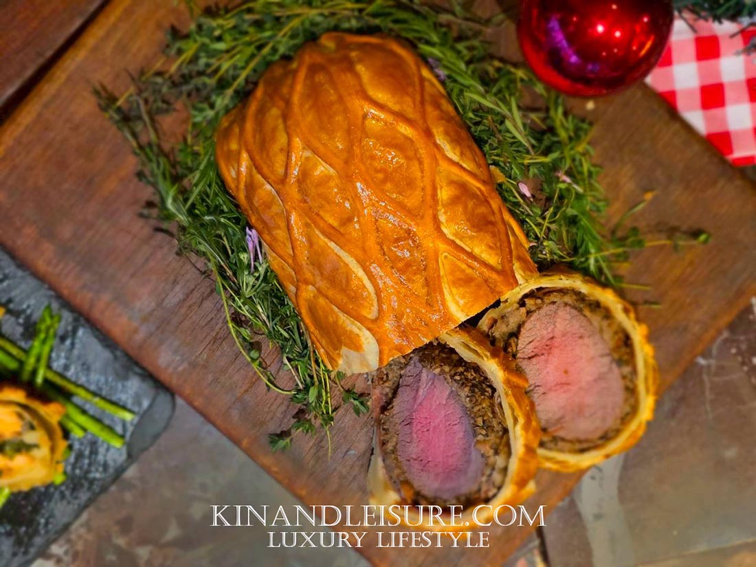 สันในวัวสีชมพูดูสดสวย ช่างฉ่ำรวยรสสัมผัสอันล้ำเลิศ ห่อด้วยแป้งพายทองอันบรรเจิด กลิ่นเห็ดเกิดเคี่ยวข้นจนหอมนวล ความกรอบแป้งตัดความนุ่มของเนื้อใน กลิ่นเนยใสพุ่งกระจายทุกส่วนสัด รสชาติเนื้อชุ่มฉ่ำประจักษ์ชัด เป็นสมบัติแห่งสำรับอันเลิศเลอ