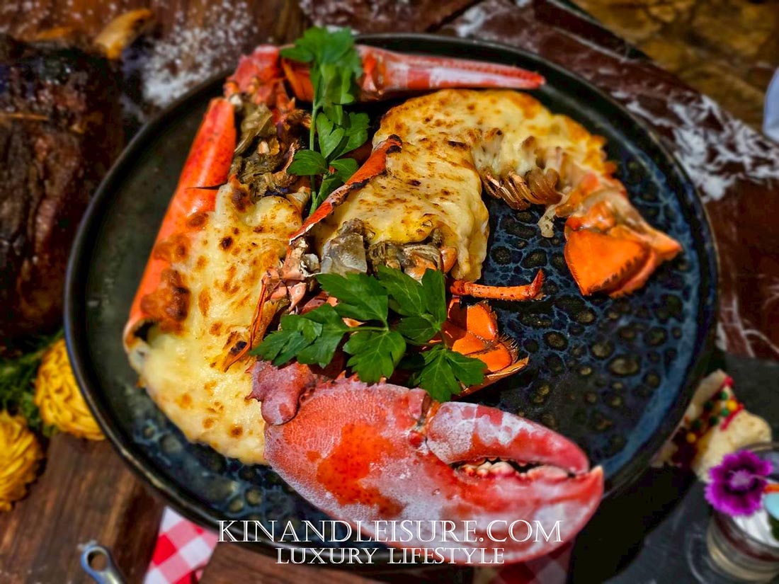กุ้งมังกรตัวโตอาบชีสเยิ้มๆ กลิ่นหอมจัดชวนหยิบจับ รสสัมผัสเนียนหนึบช่างเย้ายวน เนื้อล็อปสเตอร์แน่นเด้ง ผิวนอกถูกเบิร์นไฟเหลืองทองดูดี มีความหวานเนื้อกุ้งพุ่งปะทะรสเค็มมัน สัมผัสสวรรค์ชั้นเลิศช่างแน่นหนัก เป็นจานหรูคู่สำรับที่น่ารัก ฝากรสความจำหลักไว้ที่ปลายลิ้น