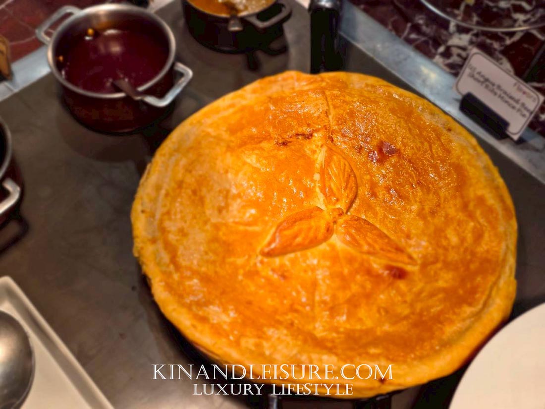 แป้งพายสีเหลืองทองอร่ามขัดเงาสวย ประดับลายใบไม้ประณีตดูโอ่อ่า กลิ่นเนยหอมกรุ่นลอยออกมาจากชั้นแป้งที่ซ้อนทับกันนับร้อยชั้น ผิวนอกกรอบเกรียวส่งเสียงยามสัมผัส ส่วนเนื้อในบรรจุด้วยไส้รสเข้มข้นที่ปรุงอย่างใจเย็นจนเข้าเนื้อ สัมผัสได้ถึงความนุ่มของโปรตีนที่เคี่ยวจนละลายในปาก ความลงตัวระหว่างแป้งกรอบและไส้ฉ่ำคือศิลปะการทำอาหารที่หาตัวจับยาก