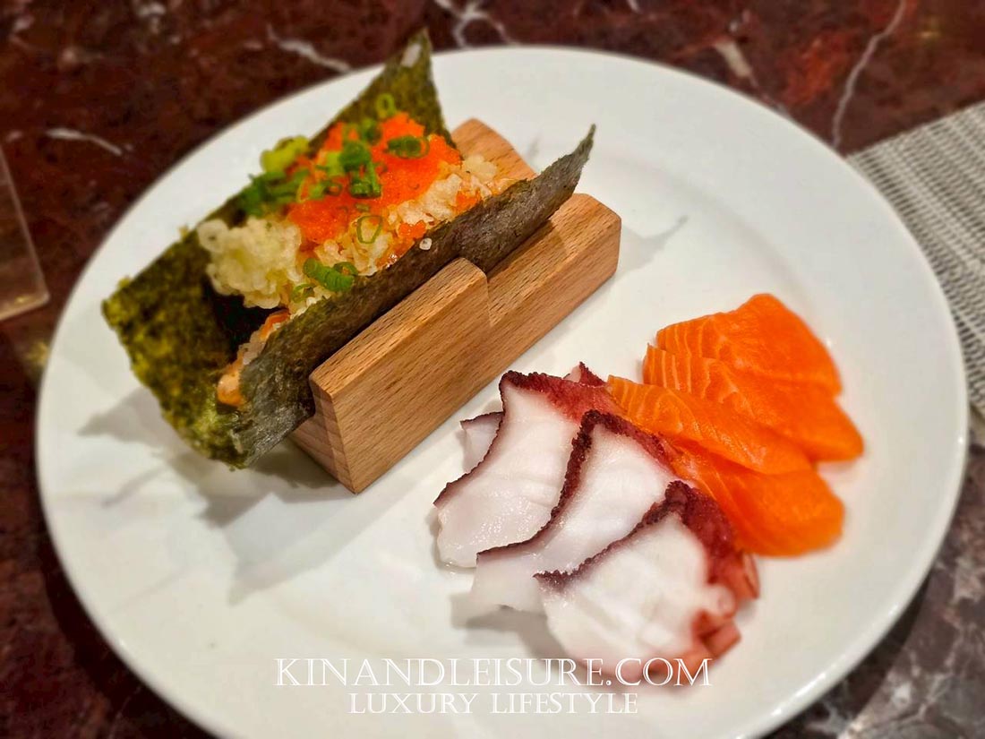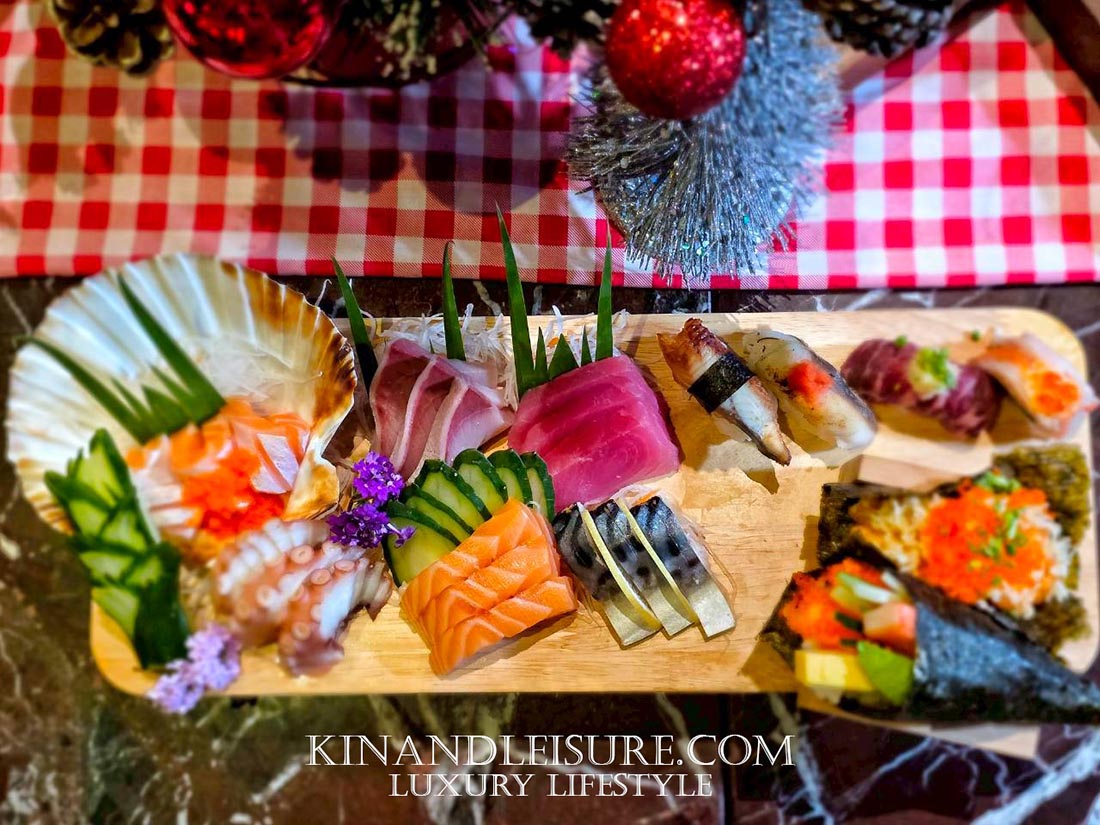 เริ่มที่ถาดรวมมิตรพิจิตรศิลป์ ชิ้นปลามินสดสะอาดชาติอาหาร ส้มละมุนนวลนุ่มนวลเนื้อปลาแซลมอน ทูน่าแดงเด้งรับกับเพดานลิ้น กลิ่นทะเลหอมระรื่นชื่นนาสิก ปลาซาบะดองเค็มเปรี้ยวเคี้ยวสนุกหนึบ กลิ่นหอมลึกจากการหมักสลักใจ ทั้งหมึกยักษ์ขาวสะอาดชิ้นหนาใหญ่ หอยเชลล์หวานล้ำฉ่ำเย็นเป็นที่สุด ประดับสวยด้วยไข่ปลากรุบกรับ