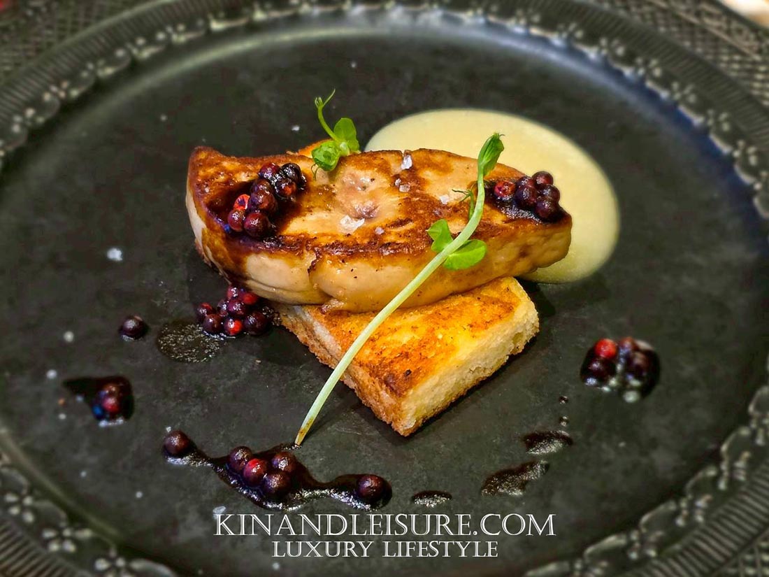 ตับห่านทองคำชิ้นโตโอ่อ่าระยับ วางสลับบนขนมปังปิ้งสีเหลืองนวลหอมกรุ่น ผิวหน้าฟัวกราส์ย่างจนเกรียมสวยแต่เนื้อในละลายระรวยดั่งวิมาน กลิ่นไขมันหอมฟุ้งจรุงใจประสานซอสเปรี้ยวหวานสีเข้มที่หยดประดับดั่งอัญมณี ตัดเลี่ยนด้วยมูสผลไม้เนื้อเนียนละเอียดที่เคียงข้าง สัมผัสแรกคือความกรอบบางของผิวที่ถูกไฟเผา ก่อนจะพบความนุ่มนวลฉ่ำวาวซึมลึกถึงโคนลิ้น รสสัมผัสหรูหราเกินบรรยายประหนึ่งรสแห่งสวรรค์