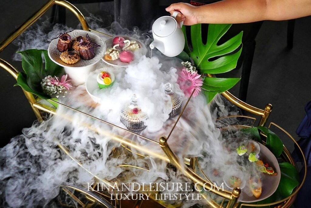 จากนั้นไม่นานเลย พนักงานเข็นรถชุดน้ำชาวันนี้มาแล้ว ยิ่งตอนที่มีควันแล้ว ชวนให้นึกถึงสวนสวยในจินตนาการขึ้นมาจริงๆ เราสามารถขอถ่ายรูปคู่กับรถเข็นก่อนได้ด้วยนะคะ