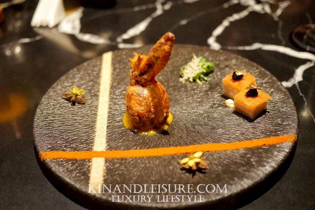 ปีกไก่ ถูกเลาะกระดูกออกอย่างละเอียดก่อนนำไปยัดข้าวเหนียวผสมซอสถั่วเหลืองจีนและหอมเจียว ปรุงกลิ่นด้วยซีอิ๊วเก่า น้ำมันงา และเครื่องเทศกวางตุ้ง จากนั้นนำไปทอดจนหนังกรอบสุกทั่ว มีสีทองแดงเงา ด้านในยังคงชุ่มฉ่ำ เมื่อตัดจะเห็นเนื้อข้าวเหนียวแน่นเป็นเม็ด แต่ไม่แฉะ เชฟวางปีกไก่ในแนวตั้งให้ชูขึ้นราวเปลวไฟที่เต้นอยู่กลางจาน บนฐานซอสเห็ดทรัฟเฟิลสีน้ำตาลเข้มที่มีกลิ่นดินอ่อน ๆ เป็นพื้น เส้นแนวผงปาปริก้าสีส้มและเกลือทะเลสีอ่อนถูกขีดพาดตัดกันบนจานหินเป็นเส้นทแยง ราวลายพู่กันบนผืนผ้าใบ — เส้นสีร้อนและเย็นนี้ช่วยสร้างความตึงเครียดทางสายตาอย่างจงใจ