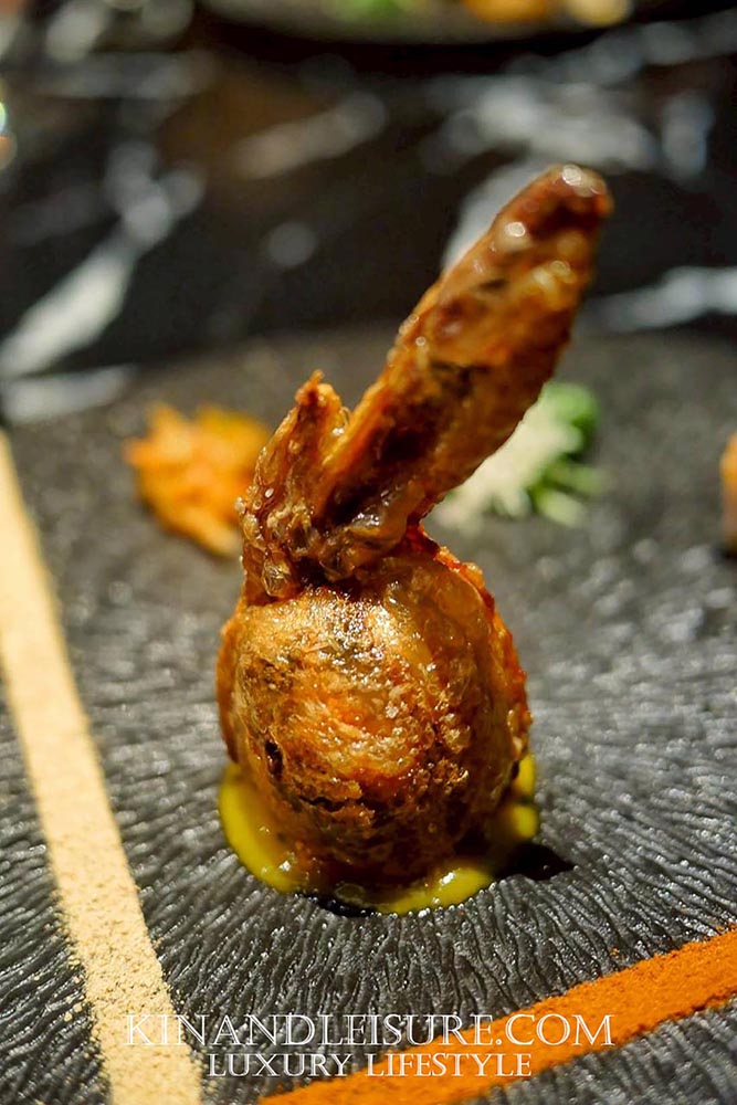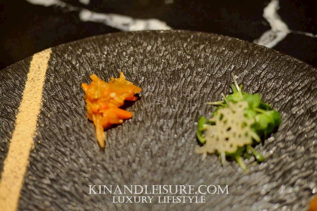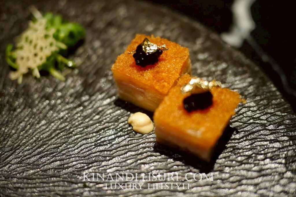 หมูกรอบสองก้อนขนาดเท่าแท่งนิ้วมือ เนื้อสามชั้นถูกอบจนชั้นไขมันแทรกละลาย ผิวหน้ากรอบแห้งเป็นแผ่นบางสะท้อนแสง แต่งหน้าแต่ละก้อนด้วย คาเวียร์สีดำและทองคำเปลวแท้ ที่ให้ประกายระยับเมื่อสะท้อนแสงไฟเหนือโต๊ะ นี่คือ “การให้เกียรติหมูกรอบ” ในระดับ fine dining อย่างแท้จริง