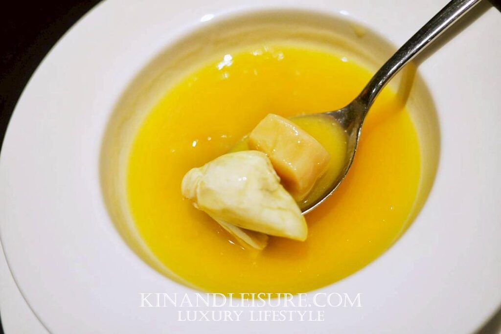 เชฟนำเทคนิคอิตาเลียนมาผสมความละเมียดของกวางตุ้ง ข้าวอาร์โบริโอถูกเคี่ยวในซุปไก่และซอสหอยเชลล์สูตรลับจนเมล็ดข้าวเด้งนุ่ม ราดด้วยกระเพาะปลาสดตุ๋นจนนุ่มละลายในปาก กลิ่นหอมครีมและน้ำซุปหอยเชลล์เจือไวน์ขาว ปลายลิ้นสัมผัสเนื้อข้าวเด้งนุ่มเคลือบซอสหนืด มีกลิ่นทะเลอ่อนๆ จากกระเพาะปลา ให้ความรู้สึกหรูหราแต่สงบ กระเพาะปลาสดหรือ Fish Maw ถือเป็นวัตถุดิบหรูในครัวจีนกวางตุ้ง เชฟใช้เทคนิค ตุ๋นด้วยซุปไก่และแฮมจินหัว (Jinhua Ham) อย่างช้าในอุณหภูมิคงที่นานหลายชั่วโมง เพื่อให้คอลลาเจนในกระเพาะปลาคลายตัว กลายเป็นเนื้อสัมผัส “นุ่มแต่มีแรงต้านปลายฟัน” ที่ไม่ยุ่ยและไม่เละ