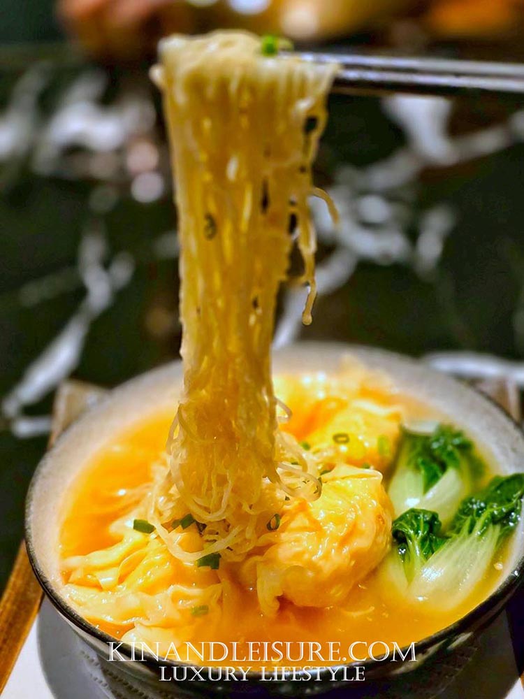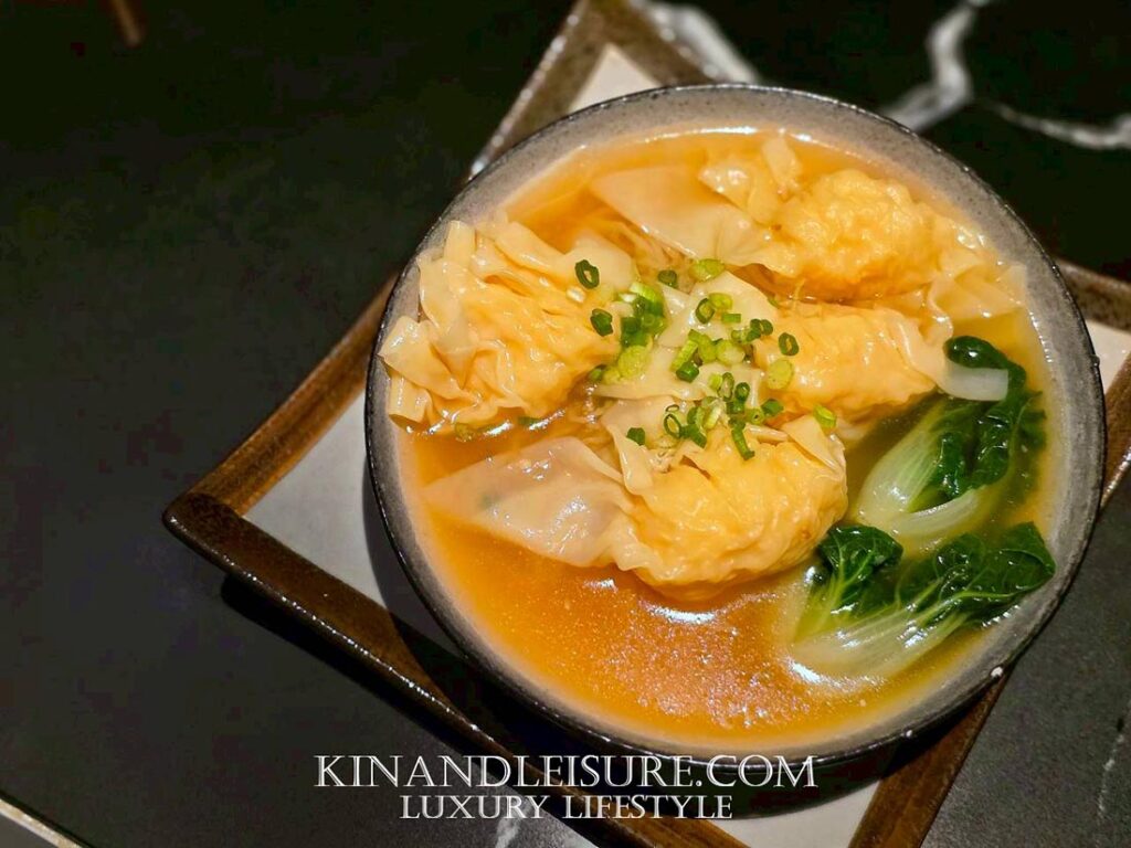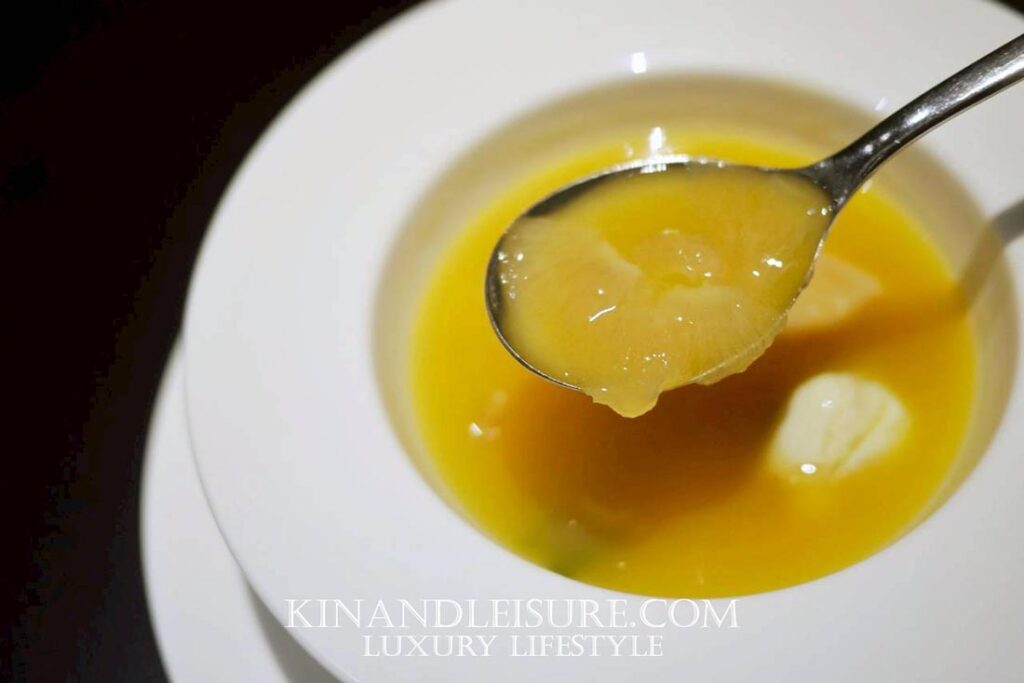 น้ำซุปที่ใช้ไก่อ่อนเคี่ยวนานกว่า 12 ชั่วโมงจนใสแต่เข้มข้น กลิ่นหอมกระดูกไก่และกังป๋วยแห้งผสมกลิ่นหวานทะเลจากเนื้อปูสด แน่น หวาน ก้อนโต ขึ้นมาเป็นชั้นกลิ่นซับซ้อนที่นิยามความ “ลุ่มลึก” ของอาหารกวางตุ้งได้อย่างสมบูรณ์ ซุปใสแต่กลมกล่อมและลุ่มลึก หูฉลามนุ่มละมุนเหมือนเส้นวุ้นกรอบละเอียด ขับรสหวานจากเนื้อปูสดและกังป๋วยรสเค็มนิดอูมามิหน่อยที่ให้กลิ่นคล้ายหอยเชลล์แห้ง