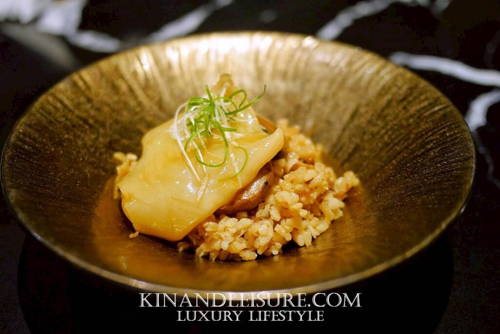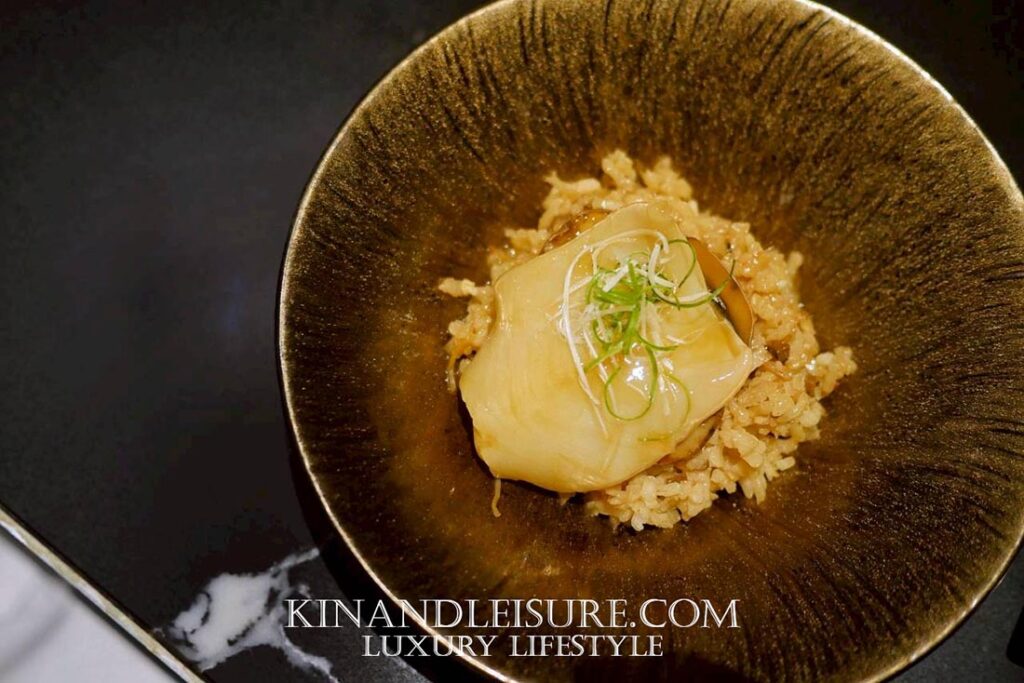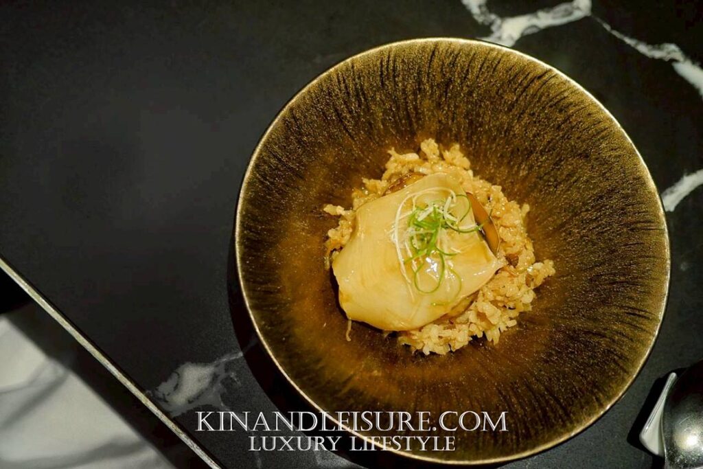 กระเพาะปลาชิ้นใหญ่ถูกซับให้แห้งแล้วนำมาทาซอสเข้มข้นที่ได้จากน้ำตุ๋นเคี่ยวซ้ำจนกลายเป็น reduction สีทองใสเงา กลิ่นหอมเนียนของแฮมจินหัวและเห็ดหอมจีนผสานเป็นกลิ่นควันบางเบา ขณะเดียวกันฐานของจานคือ ข้าวญี่ปุ่นสายพันธุ์สั้น ที่นำมาทำรีซอตโต้โดยใช้เทคนิคอิตาเลียนแท้ — ใช้น้ำซุปไก่กวางตุ้งแทนน้ำสต๊อกตะวันตก ค่อย ๆ เติมทีละน้อยและกวนให้ข้าวคลายแป้งออกมาจนได้เนื้อสัมผัส “creamy” อย่างเป็นธรรมชาติ