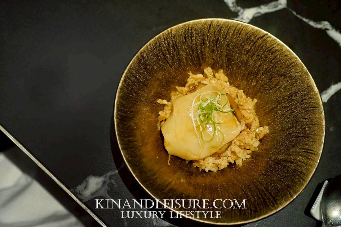 สุดท้ายเชฟผัดข้าวด้วยน้ำมันหอยสูตรของร้าน เติมเห็ดทรัฟเฟิลสับและซีอิ๊วขาวเล็กน้อยก่อนวางกระเพาะปลาที่ตุ๋นแล้วด้านบน และราดด้วยซอสใสจากน้ำสต๊อกอีกชั้นให้เกิดประกายเงา