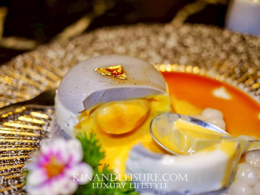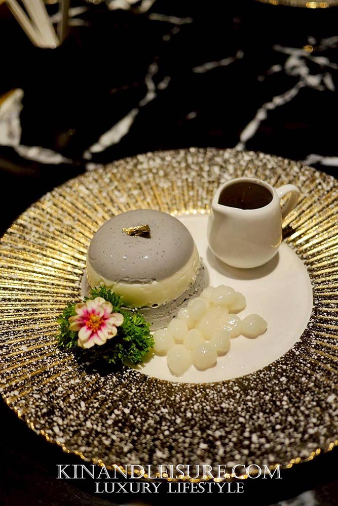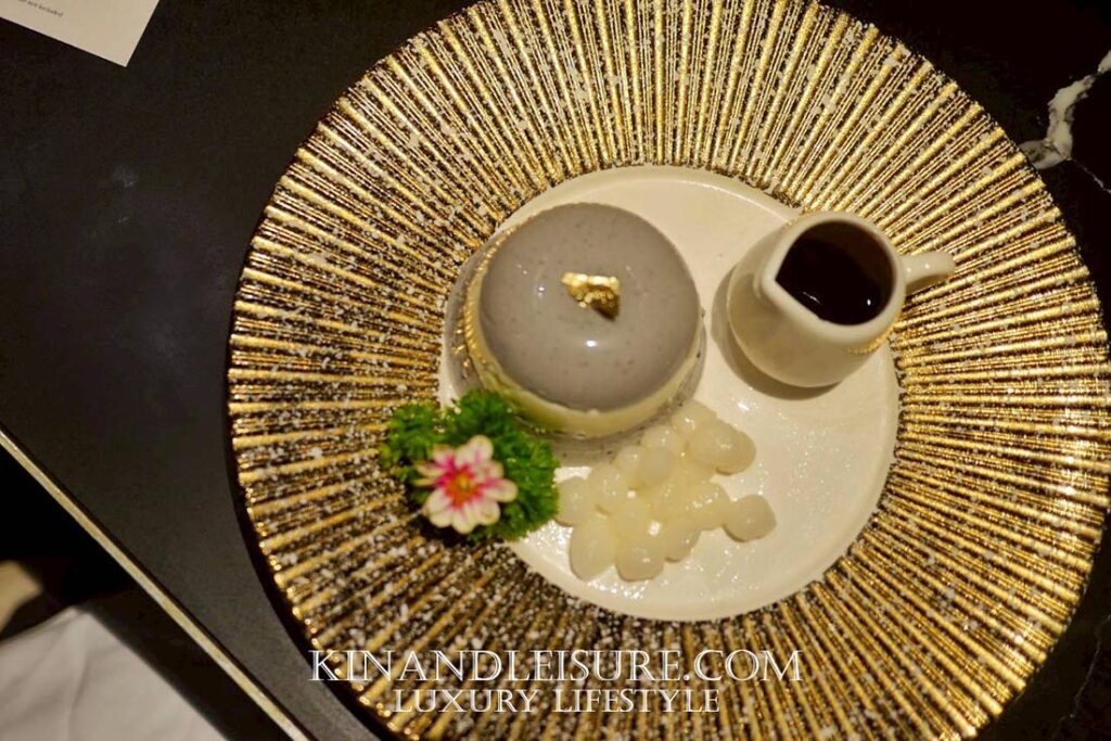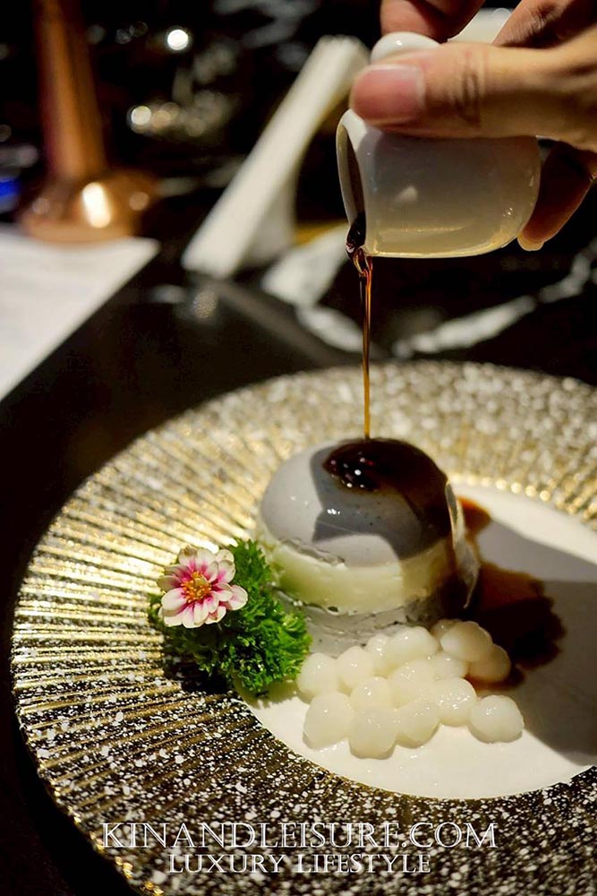 เชฟใช้จานเซรามิกขาวขอบทองหยักบานดั่งดาราอาทิตย์ โรยผงงาดำบางๆ เป็นเงาเหมือนหมึกจีน ข้างจานแต่งด้วยกลีบดอกเก๊กฮวยแห้งสีทองบางเบา และเกล็ดทองคำเล็กๆ บนตัวพุดดิ้ง