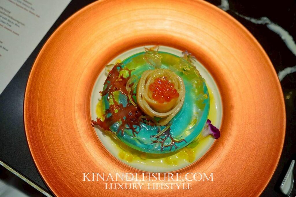 เชฟใช้ “หลักองค์ประกอบวงกลมซ้อน” เพื่อเลียนแบบภาพมุมสูงของทะเล — ขอบส้มทองแทนแสงตะวันตกดิน ส่วนชั้นน้ำแข็งสีฟ้าแทนผิวน้ำที่สะท้อนฟ้า การใช้โทนสีเย็นกับอบอุ่นในจานเดียวกันสร้างความสมดุลทั้งอารมณ์และรสชาติ นี่คือการ “วาดภาพทะเล” ด้วยวัตถุดิบที่กินได้จริง