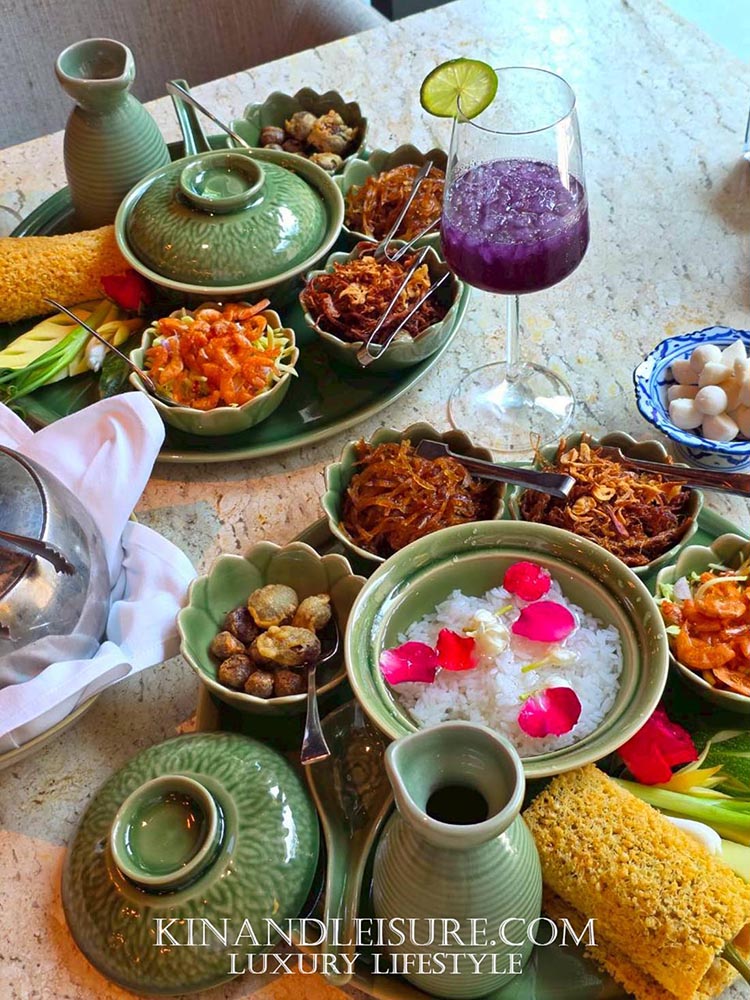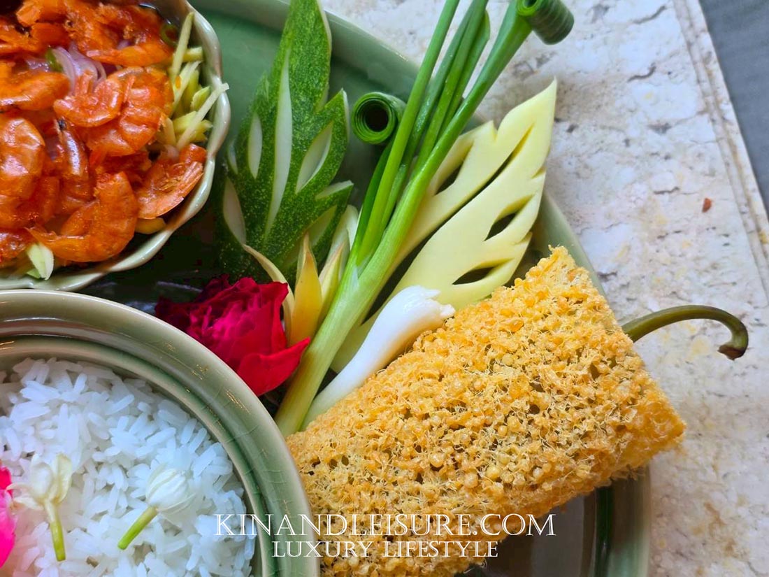สิ่งที่ทำให้ข้าวแช่ของ Sindhorn Kempinski น่าสนใจไม่ใช่ความอลังการ แต่เป็นการรักษาสมดุลระหว่างความเป็นพิธีการกับความเป็นอาหารจริงจัง ภาพสำรับที่ถ่ายมาจากมุมบนเผยให้เห็นความเป็นระเบียบที่มากกว่าความสวยงาม ภาชนะสีเขียวเรียงรายราวกับพงศาวดารของรสชาติ ใบตองหรือเครื่องตกแต่งที่ใช้ในบางชิ้นช่วยย้ำความเป็นไทย ขณะที่การจัดวางทั้งหมดสะท้อนมาตรฐานระดับโรงแรมหรูอย่างชัดเจน