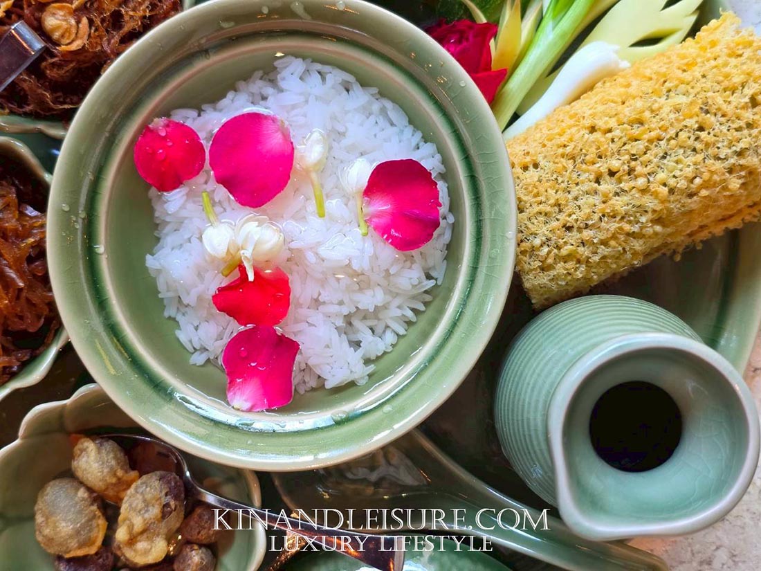 การจัดสำรับของที่นี่มีความร่วมสมัยแต่ไม่หลุดจากหลักการของข้าวแช่ดั้งเดิม ภาชนะขนาดเล็กหลายใบถูกวางเรียงอย่างมีจังหวะ ทำให้แต่ละเครื่องเคียงมีพื้นที่ของตัวเอง ไม่ปะปนกันจนสูญเสียอัตลักษณ์ ข้าวแช่ถูกบรรจุในถ้วยลึกทรงกลมสีเขียวเซรามิก วางดอกไม้สีชมพูอ่อนบนผิวข้าวเพื่อสร้างทั้งความงามและความหมาย เชิงประเพณีดอกไม้ไม่ได้เป็นเพียงของประดับ แต่เป็นสัญญะของความอ่อนละมุน ความหอม และความเป็นอาหารฤดูกาลที่เชื่อมคนกินกับบรรยากาศของหน้าร้อน