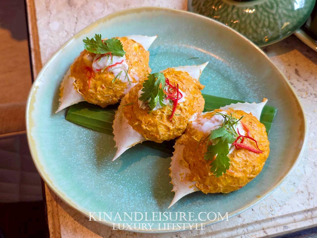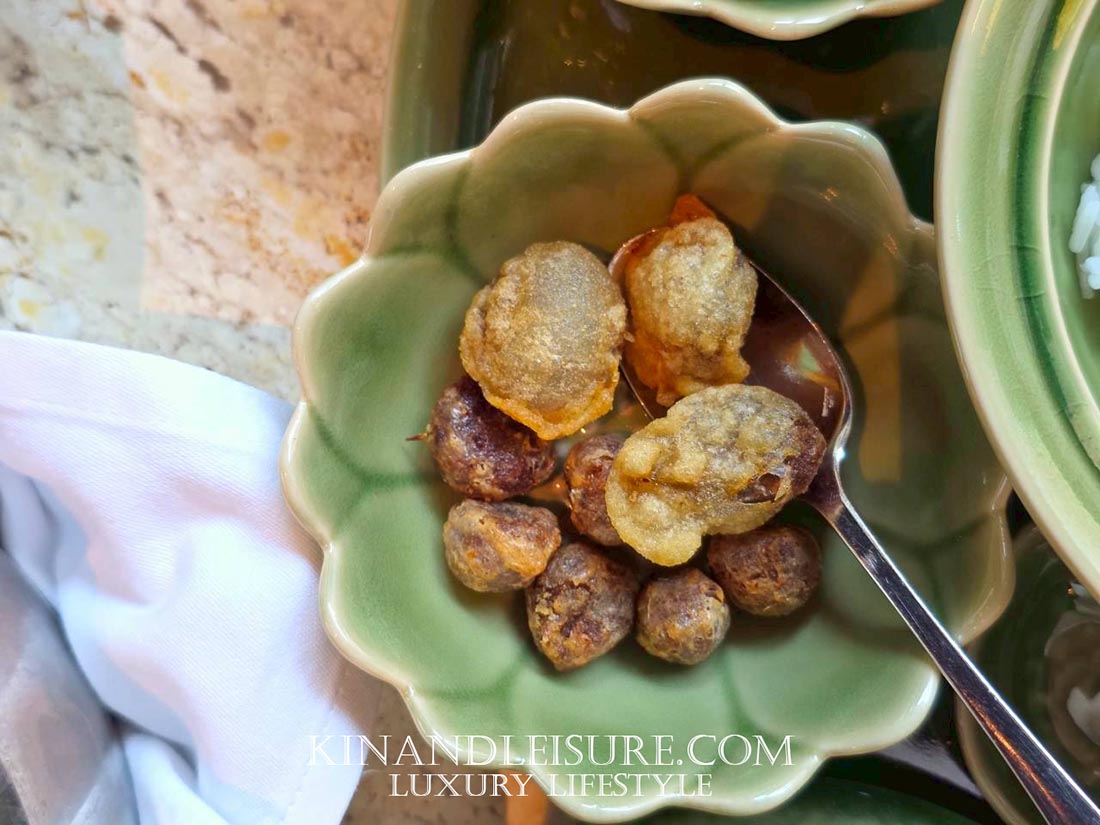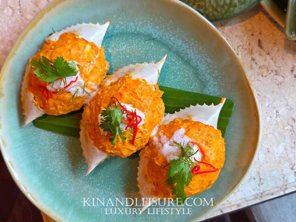 ในชุดของ Sindhorn Kempinski การทอดดูมีความเนี๊ยบ สีสันออกน้ำตาลทองอย่างสม่ำเสมอ ไม่ใช่การทอดแบบบ้าน ๆ ที่เน้นปริมาณ แต่เป็นงานครัวที่คิดมาแล้วว่าชิ้นแต่ละชิ้นต้องทำหน้าที่อะไรบนโต๊ะ