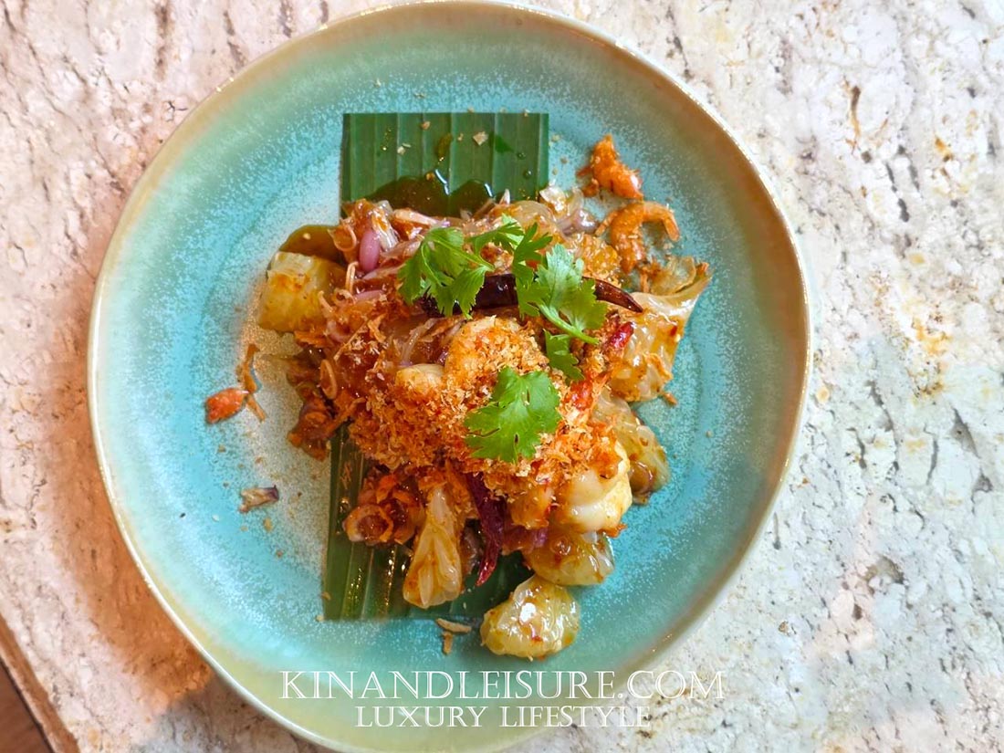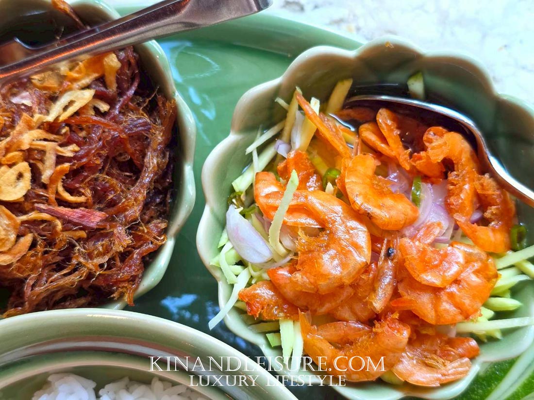 มะม่วงดิบให้ความกรอบและความเปรี้ยวสด ขณะที่กุ้งเสียบให้กลิ่นทะเลแห้ง ๆ ที่เข้มและมีมิติ เมื่อผสมกันแล้วจะได้รสเปรี้ยวเค็มหวานที่ไม่ทื่อ แต่มีโครงสร้างของความสดอยู่ชัด สำรับนี้มีการแยกยำมะม่วงกุ้งเสียบมาอยู่ในถ้วยของตัวเอง ทำให้สัมผัสถึงความตั้งใจที่จะไม่ให้รสเปรี้ยวปะทะกับเครื่องอื่นโดยตรง แต่ค่อย ๆ ไหลเข้าสู่ลำดับการกิน