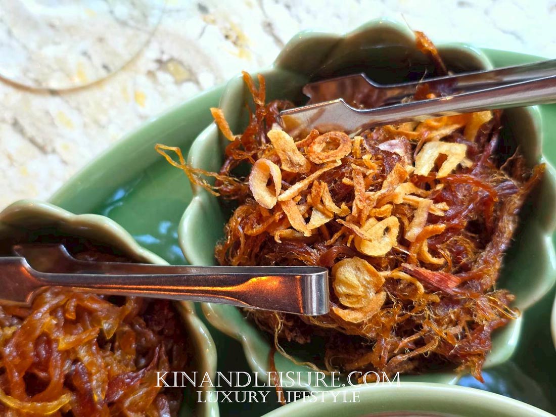 ในภาพเห็นเครื่องฝอยสีน้ำตาลเข้มอยู่ในถ้วยเล็กหลายใบ ลักษณะเป็นเส้นแห้งฟู มีการโรยหอมเจียวด้านบนในบางถ้วย นั่นคือภาษาทางสายตาที่บอกว่าอาหารจานนี้ไม่ได้ถูกทำเพื่อปริมาณ แต่ถูกทำเพื่อจังหวะสัมผัส เมื่อเข้าปากจะได้ความกรุบเบา เคี้ยวแล้วแตกตัว พร้อมกลิ่นหวานเค็มและกลิ่นหอมเจียวที่ลอยขึ้นมาอย่างชัด