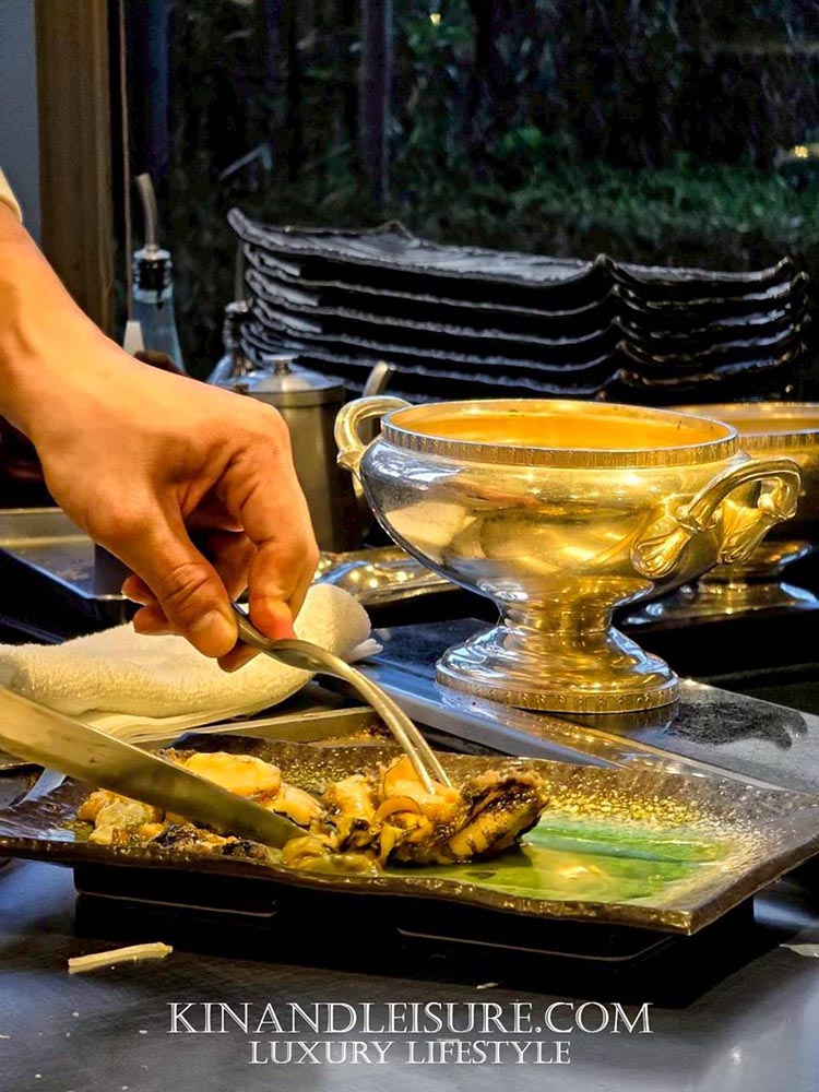 เมนูนี้คือไฮไลท์ที่พี่พีทตื่นตาตื่นใจมาก เชฟโชว์ “เป๋าฮื้อเป็นๆ” ตัวใหญ่ไซส์เท่าฝ่ามือให้ดูบนหน้าเตา ก่อนจะบรรจงตัดแต่งและใช้เทคนิคการ Steam (นึ่งด้วยฝาครอบบนเตาเหล็ก) เพื่อรักษาความชุ่มชื้นและสัมผัสที่เด้งสู้ฟันแต่ไม่เหนียวเลยแม้แต่นิดเดียว