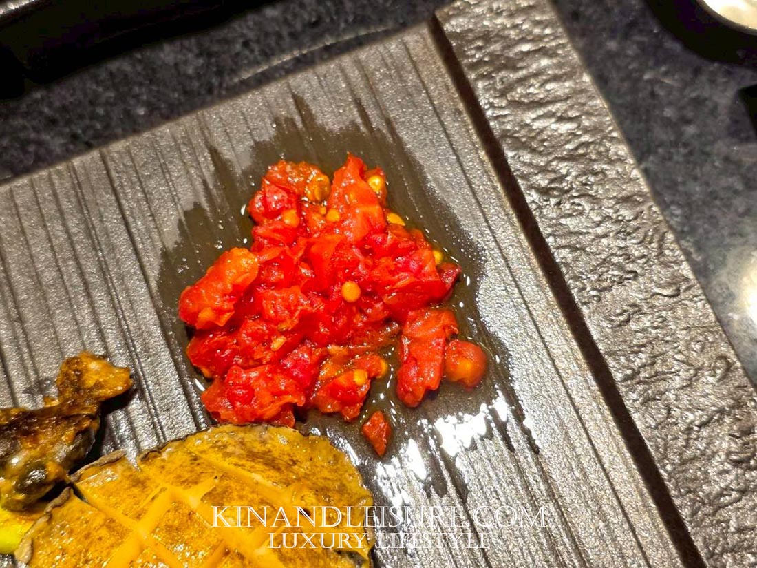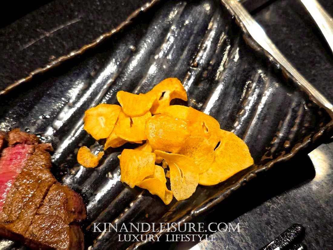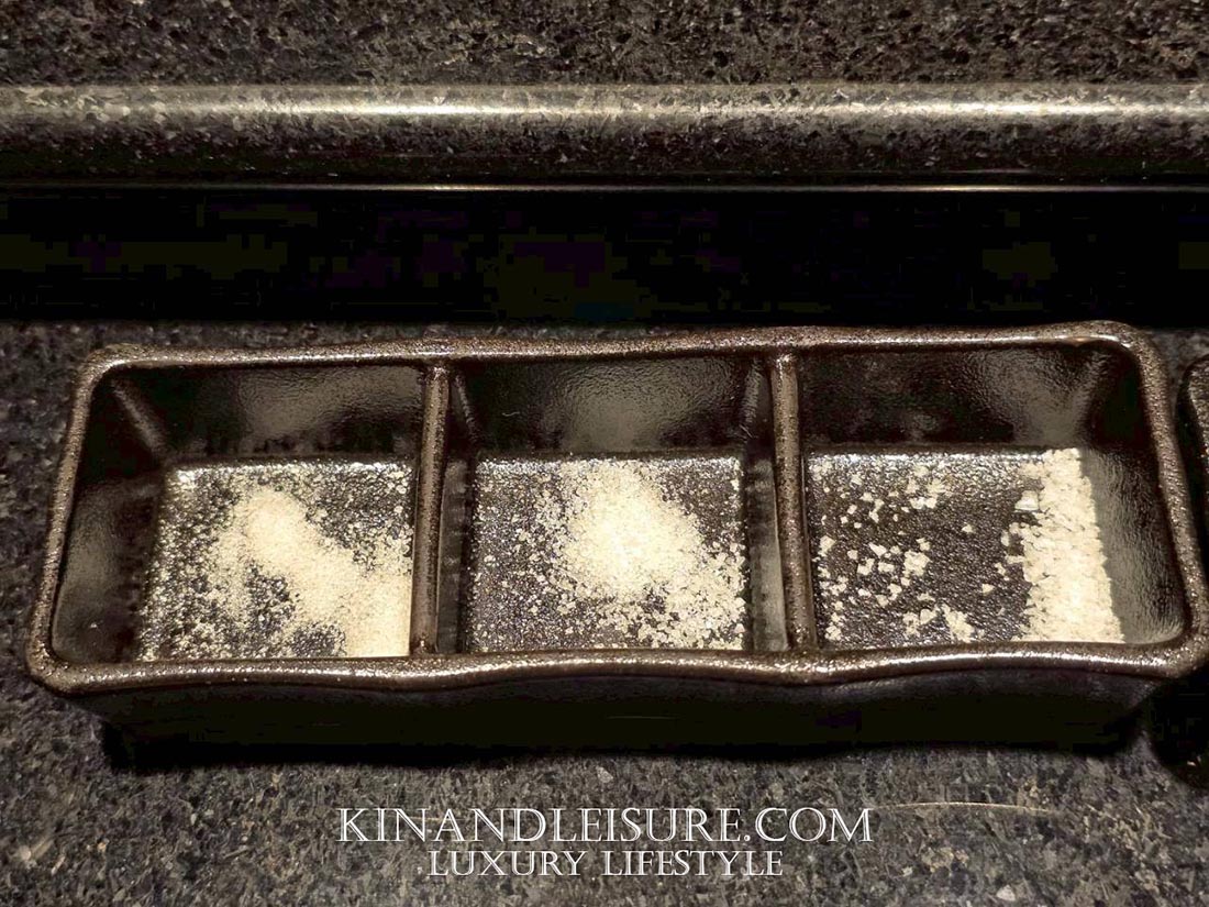 เชฟย่างแบบ Medium Rare ให้เห็นลายหินอ่อนที่สวยงาม กลิ่นเนื้อหอมฟุ้งจากการย่างบนเตาเหล็ก เสิร์ฟคู่กับกระเทียมเจียวฝานบางที่กรอบเหมือนขนม กินคู่กับเกลือ 3 ชนิด (Mongolian, Italian, Japanese) พีทแนะนำให้เริ่มจากเกลือญี่ปุ่นที่เค็มน้อยที่สุดเพื่อสัมผัสรสหวานของเนื้ออย่างเต็มที่ครับ