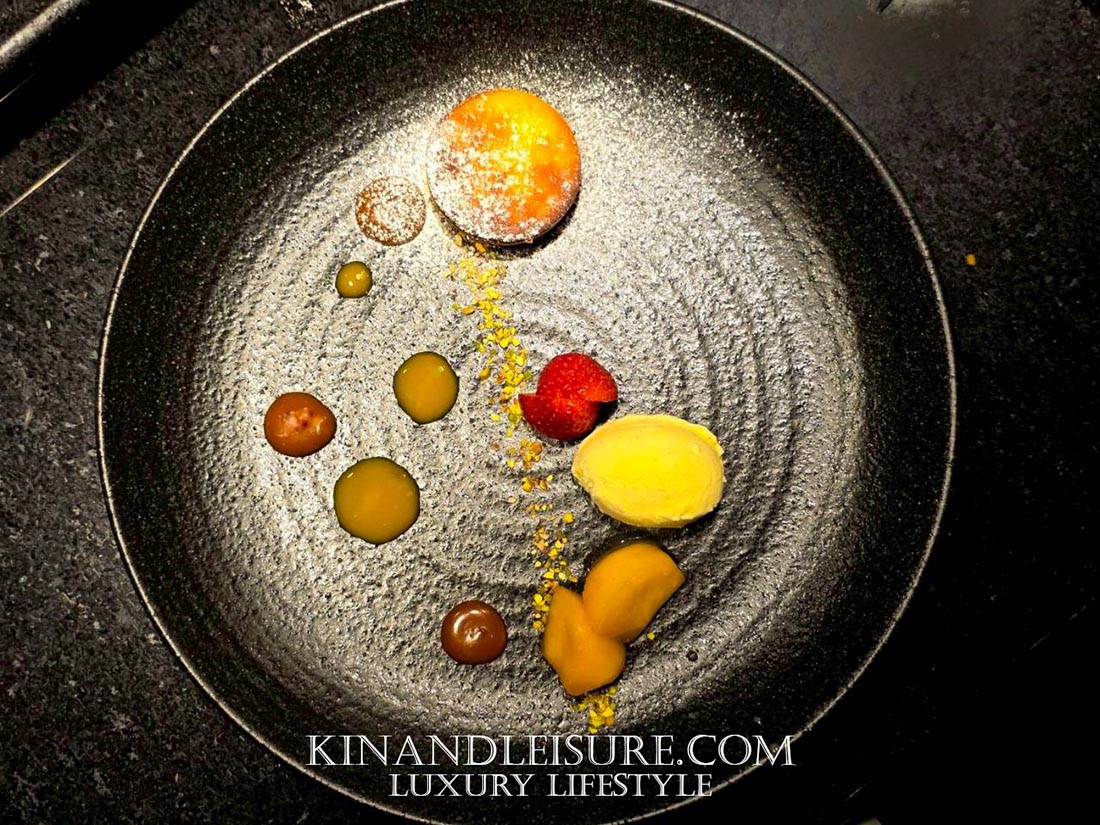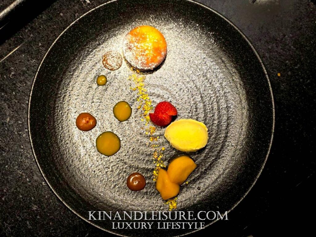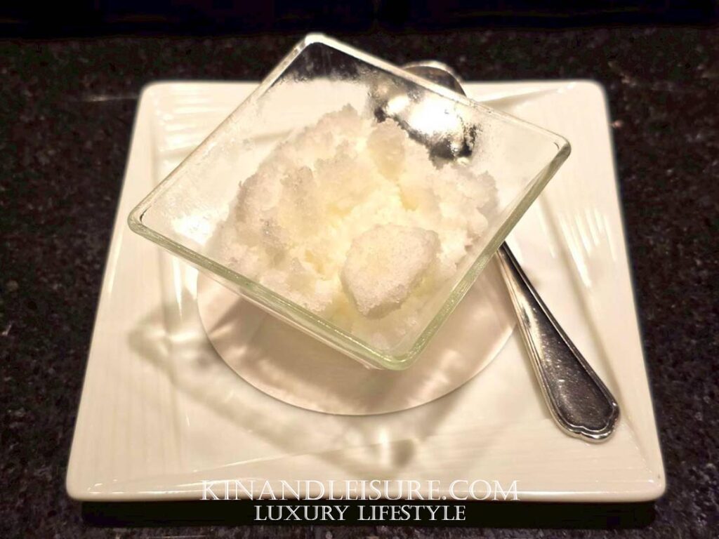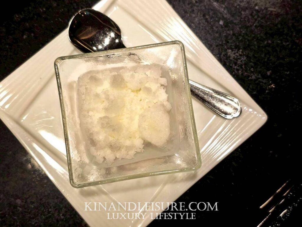ก่อนจะก้าวเข้าสู่เมนูเนื้อ เชฟเสิร์ฟ Yuzu Granita เพื่อเป็นการล้างปาก (Palate Cleanser) รสสัมผัสเป็นเกล็ดน้ำแข็งละเอียดสีขาวโพลน รสชาติเปรี้ยวปรี๊ดจากส้มยูซุแท้ๆ กลิ่นหอมสดชื่นติดจมูก ช่วยขจัดคราบไขมันและรสชาติอาหารทะเลในปาก เตรียมความพร้อมของลิ้นเพื่อรับความโอชะของเนื้อวากิวในขั้นตอนต่อไป